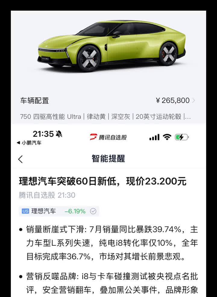 今天晚上看了小鹏的全新P7的发布会,选购了自己的订单之后准备下单的时候突然弹出了这么一个提示:理想60日新低,现价23.200元。 27月份的销量暴跌了39.74%,所有的L主力车型全部失速,纯电i8转化率只有10%,也就是新的纯电suv全年目标达成率只有36.7%,市场增长为悲观,这真的是一家欢喜一家愁。