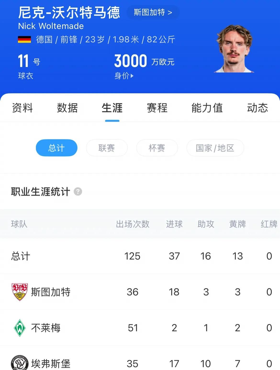 纽卡斯尔为了找伊萨克替身,真是杀红了眼! 身价3000万欧的德甲前锋!喜鹊军团花超8000万欧引进? 对的!罗马诺HWG:纽卡超8000万欧+浮动签斯图加23岁德国前锋特沃尔特马德,上赛季德甲28场12球2助。