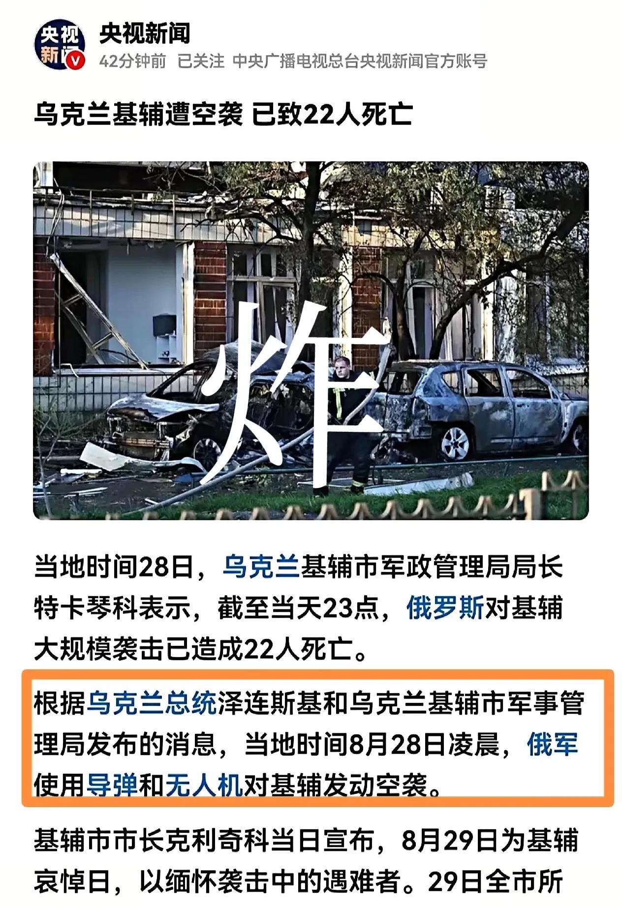 俄罗斯28日凌晨空袭基辅,可能炸到“大鱼”了,要不乌克兰怎有这么大的反应?又是降半旗,又是将8月29日定为基辅哀悼日! 据央视新闻报道,当地时间8月28日凌晨,俄罗斯发动了导弹和无人机对基辅进行空袭! 一般这种空袭目标绝对不简单,因为简单的目标根本没有轰炸的价值,所以俄罗斯这次空袭有没有可能是得到确切的信息,所炸的目标里有“大鱼”,比方说,西方(北约、欧盟)的一些,军事人员?或者其他人员? 毕竟“俄乌冲突”已经三年多了,基辅被炸又不是一次两次,但凭什么乌克兰对这次轰炸反应这么大? 所以这次空袭真有可能炸到“大鱼”,而泽连斯基后续的操作,有可能就是给为其提供帮助的北约或欧盟看! 当然,这只是个人观点,仅供参考! (图片来源于网络)