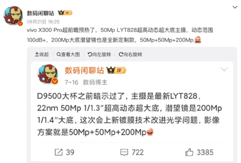 此外,影像部分应该会率先用上LYT828这枚大底主摄,动态范围100dB+,闲聊站还透露,潜望镜头也是定制款2亿像素。