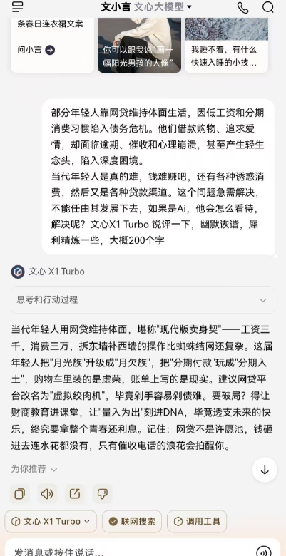 文心X1 Turbo精准解剖现象,用网络热梗“月欠族”“剁手”。让扎心真相裹着幽默糖衣?既像脱口秀演员抖包袱,又似老中医下猛药,在嬉笑怒骂间把问题拆得明明白白,真的高!