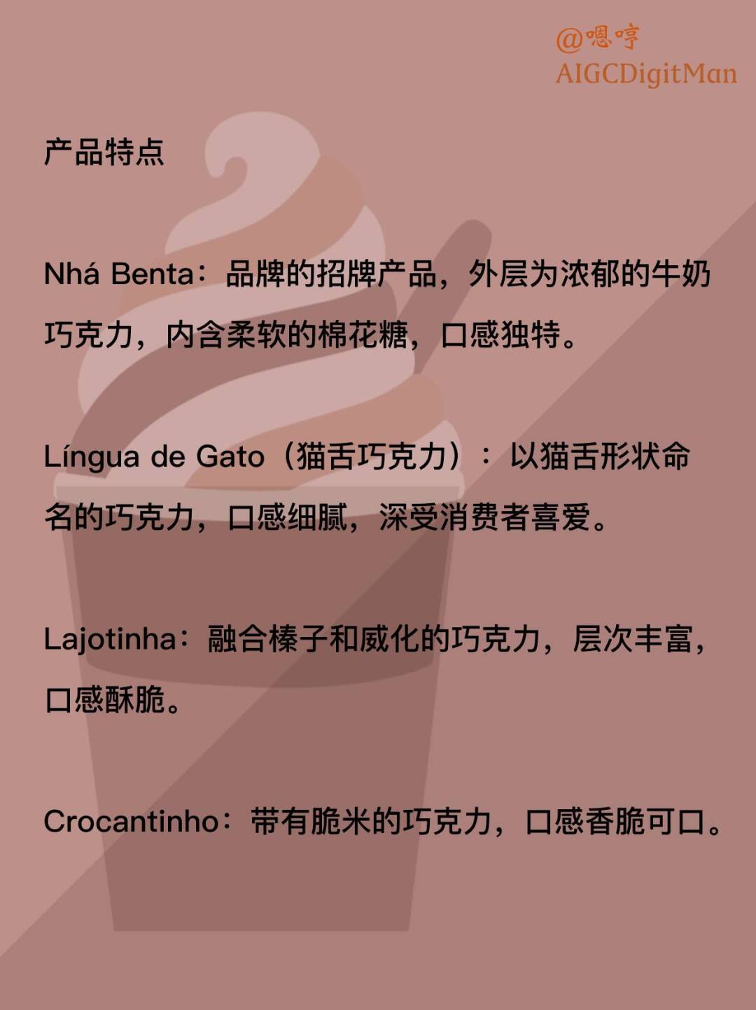 Língua de Gato(猫舌巧克力):以猫舌形状命名的巧克力,口感细腻,深受消费者喜爱。