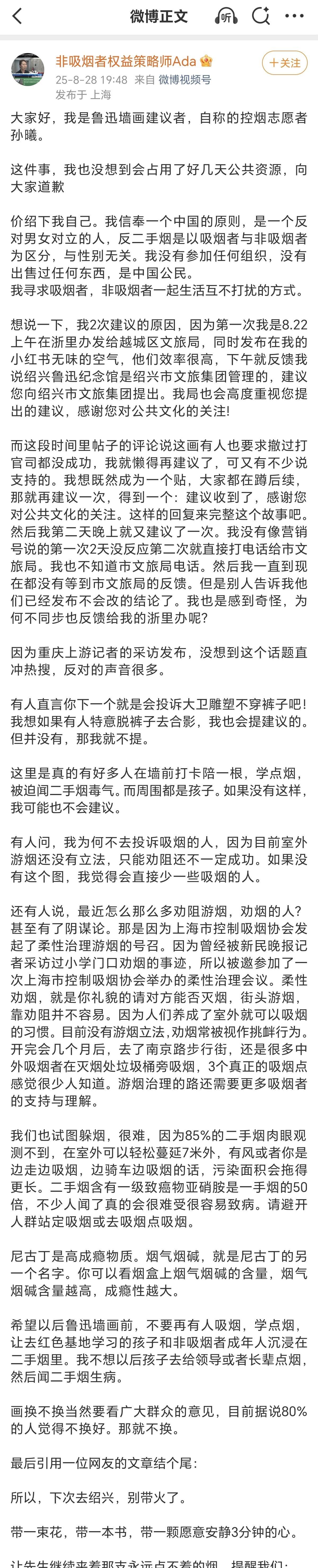 投诉鲁迅夹烟墙画当事人致歉。 这个人她是卖尼古丁袋的,说是可以代替香烟,但是这个东西国内市场上没有。也不合法。这个人没那么简单,她过往作品中有7次把国内说成大陆,推广在多个国家禁止的尼古丁袋,还让我们火车上免费提供,嘴里全是公益,兜里全是生意。她只是知道骂她的多,支持她的少才会道歉,如果反过来,她起号成功,还会洋洋得意,往后还会有更奇葩更过分的想法冒出来!