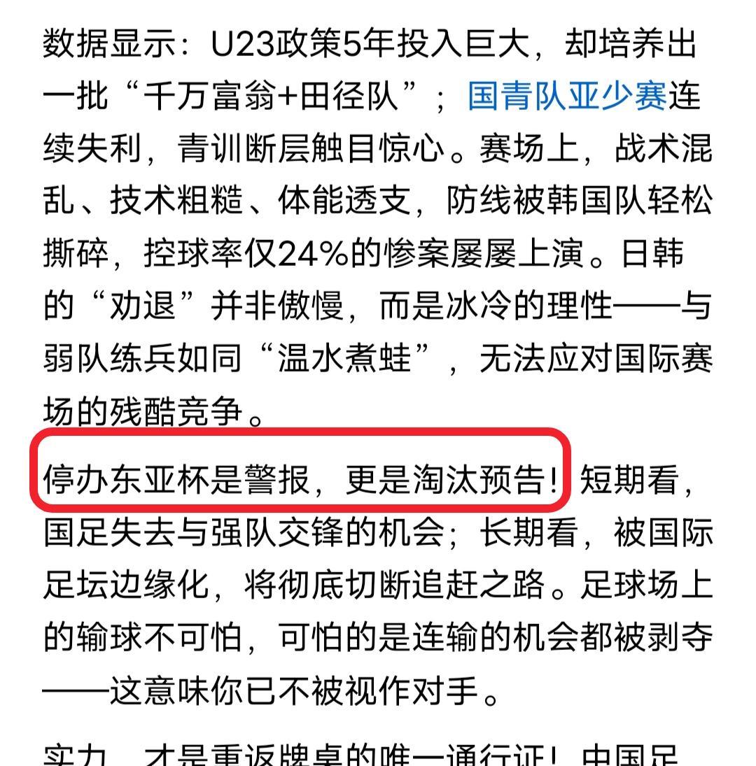 继日本足协后,韩国足协继续跟进,男足、女足东亚杯停办很可能成为现实,痛苦的是谁?当然是中国足球。 按照日、韩足协的说法,东亚杯“没有锻炼价值”。 问题是,2026年2月份开始,就轮到宋凯担任东亚足联主席了,没有了东亚杯,这个东亚足联主席不完完全全成了一个摆设了吗? 日本、韩国不屑于东亚杯的因素很多,其中最重要的一点就是对手,直白的说就是中国足球。 2002年5月28日,东亚足联成立,包含了10个成员,分别有:中国、中国香港、中国澳门、中国台北、日本、韩国、蒙古、关岛、朝鲜、北马里亚纳群岛联邦。 2023年,东亚足联举办第一届东亚杯,然后每两年一届,由中国、日本、韩国轮流做东道主。 众所周知的原因,只要轮到韩国举办,朝鲜都拒绝参赛,有时候在日本举办的比赛,朝鲜也会找理由退出,如此一来,东亚杯的含金量进一步下降。 直至今年7月份的东亚杯上,日本男足、女足都派出了三队进行应付,而韩国男足、女足参赛的也只能算是二队,他们甚至连欧洲的留洋精英都懒得召回。 时至今日,中国足协不得不重新审视自己了,为什么连亚洲的两个邻居都不愿意跟我们玩? 看一个数据吧,在欧洲踢球的日本球员早已经突破100人大关,其中女足就有30余人,而她们光是在英格兰女超的就多达18人,凭良心说,人家日本的国家队凭什么要陪我们浪费时间? 再看看韩国,他们在欧洲的男足球员有30余人,而在欧洲和美职联的女足球员也早已经多达10余人了,我们要知道,韩国女足起步晚、投入小、还没有职业化,但中国女足已经越来越难以战胜她们,韩国女足超越中国女足是一定的,只不过是时间问题。 我在想,中国足协还是赶紧加入东亚足联吧,东亚足联有印度、巴基斯坦、阿富汗、孟加拉、不丹、尼泊尔、斯里兰卡、马尔代夫8个成员国,我坚定不移的相信: 中国男足、中国女足一定可以夺得南亚杯双冠军的。