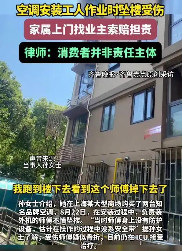 “太闹心了!”上海,一女子在商场买了两台空调,空调师傅来安装时没做好防护,不慎摔下楼疑骨折,师傅家人找不到负责的单位,多次上门让女子担责,女子的生活都被打乱了,女子叫屈:这关我什么事啊! 女子的两台空调是在正规商场买的,品牌包上门安装,三个师傅上门安装时发生意外,一师傅安装时摔到了楼下骨折了,现在还在ICU。 女子认为这事和自己没关系,安装师傅安装时没系安全带,操作失误,理应由商场或师傅所在的单位赔,但没想到五六天后,6名伤者家属轮番找上门让她担责。 女子被堵得出不了门,她联系品牌和商场,两边却像踢皮球一样,都不给个明确说法,女主夹在中间,急得直掉眼泪! 遇到这事太闹心了,谁能想到安个空调会发生这样的意外,这事的责任怎么也轮不到女子来担责。 从法律角度来看,女子作为空调的购买者,商场承诺包上门安装,女子与商场之间形成了承揽关系 。 根据《民法典》第一千一百九十三条规定,承揽人在完成工作过程中造成自己损害的,定作人不承担侵权责任,但是定作人对定作、指示或者选任有过错的,应当承担相应的责任。 女子在此次事件中,既没有对安装工作进行指示或帮助,也不存在选任方面的过错,因为她是从正规商场购买的空调,商场安排的安装师傅通常应具备相应资质和技能 。所以女子不应该承担此次事故的责任 。 安装师傅作为专业人员,没有系安全绳,违反了安全操作规范,属于自身操作失误,应承担主要责任 。 商场或师傅所在的单位,作为接受劳务的一方或承揽人,没有尽到对安装师傅的管理和监督责任,没有确保安装师傅遵守安全规范,也应承担相应的责任。 老话说:没有金刚钻,别揽瓷器活,我们做事要具备相应的能力和资质,同时别心存侥幸,干活时务必做好安全防护!