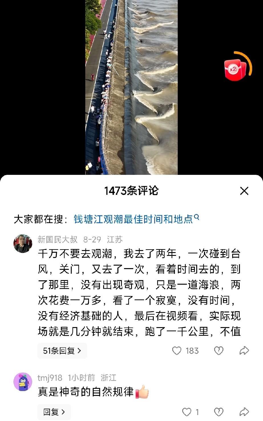 千万不要去钱塘江观潮,我去了两年,一次碰到台风,关门,又去了一次,看着时间去的,到了那里,没有出现奇观,只是一道海浪,两次花费一万多,看了一个寂寞,没有时间,没有经济基础的人,最后在视频看,实际现场就是几分钟就结束,跑了一千公里,不值! 到底值不值?这是见仁见智的事情,但是出去旅游,花费肯定是有的,而且肯定不低,需要有钱有闲,并且还要有心情,有些人很有钱,也很有钱,就是不愿意出去,有的人想出去游玩,可没有钱,没有时间。 其实,我发现,最好的观看和欣赏不是到现场,而是追随镜头欣赏。 到现场,只不过是体现而已,未必会看到完美的景色。 钱塘江观潮非常出名,我没有到过一次现场,但是我已经看过非常多的奇观了。比如说本图的神龙摆尾,比如说两潮交叉,还有鱼鳞潮,还有四潮交汇。 从高空角度观赏,非常壮观。但是在现场,如果仅仅凭自己的双眼,未必会看到那么壮观的景色。 #秋日生活打卡季#