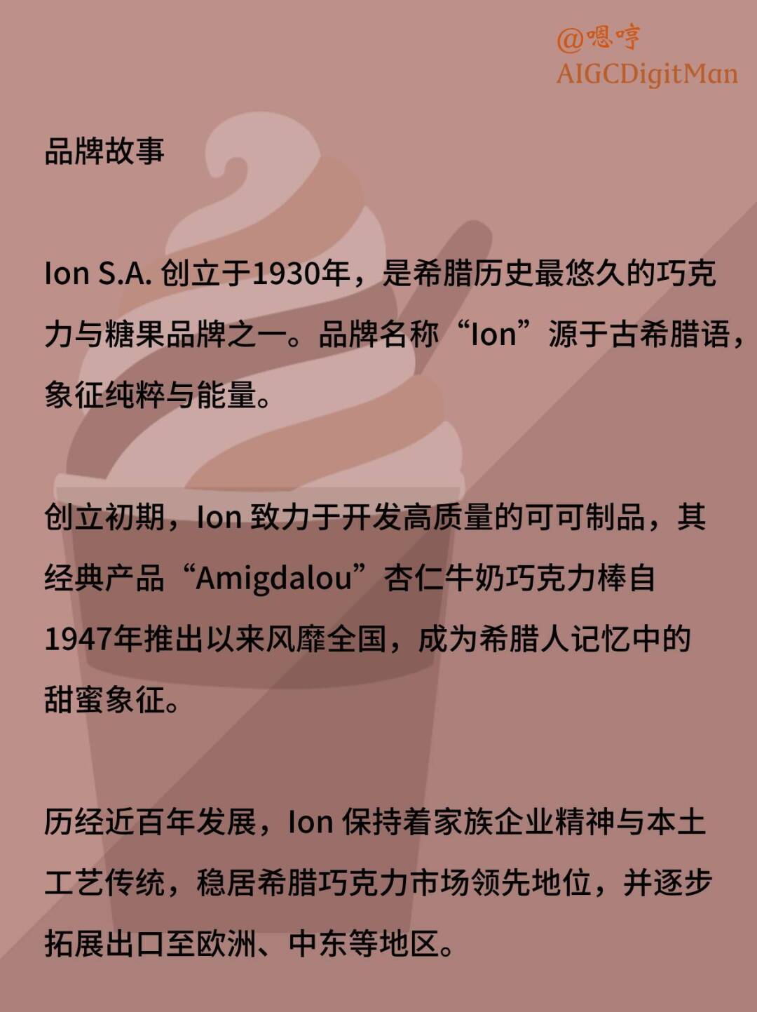 历经近百年发展,Ion 保持着家族企业精神与本土工艺传统,稳居希腊巧克力市场领先地位,并逐步拓展出口至欧洲、中东等地区。