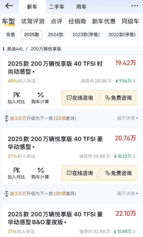 现在入手A4L还是等等A5L啊 随着A5L Sportback公布的信息越来越多,很多准备购入A4L的小伙伴都开始犹豫了。要不要等A5L呢?本来说是六月底公布价格上市,目前最新消息又说要延迟到七八月份了。那小伙伴们要不要等等A5L呢?或者是直接入手A4L?建议看看以下对比再做决定。 首先是价格方面。A4L目前终端优惠力度非常大,低配裸车价甚至跌破19万元,顶配落地价也在28万元左右。作为一款豪华品牌B级车,这个价格确实非常诱人。不过,大幅降价也影响了它的保值率——比如2023年的二手A4L现在只能卖到15万元左右,比同期的宝马3系低了12%。 A5L Sportback预估起售价29.98万元,顶配可能接近40万元。虽然比进口版便宜不少,但作为全新车型,初期优惠空间较小。不过它标配激光雷达和华为高阶智驾,相当于把未来几年的技术提前装上车,对追求前沿配置的用户来说,这个溢价不算夸张。 其次是设计。A4L的设计偏保守,内饰沿用10.1英寸悬浮屏+实体按键组合,科技感明显落后于同年的宝马3系或奔驰C级。配置也较为基础,比如L2级辅助驾驶只有顶配支持,且需额外选装,全系无全景影像。A5L Sportback拥有无框车门和溜背造型。内饰三屏布局(11.9英寸仪表+14.5英寸中控+10.9英寸副驾屏),搭配华为智驾,在智能化上更接近国产新势力。 动力对比的话,A4L搭载第三代EA888 2.0T发动机,匹配7速双离合变速箱,高功率版(245马力)0-100km/h加速6.6秒。动力成熟可靠,但双离合在低速时偶有顿挫,且全系无轻混系统。 A5L Sportback升级了第五代EA888 2.0T+48V轻混,最大功率200kW(272马力),0-100km/h仅需6.4秒。轻混系统优化了低速平顺性和油耗(城市工况约5.6L/百公里),比A4L省油不少。不少网友可能会担心48V轻混的稳定性,毕竟不少品牌包括奥迪自家之前的48V都有过故事。 最后建议准备入手A4A5的车友们,假如你更看重性价比和当下用车成本,A4L现阶段的低价确实很难拒绝;但如果你期待一辆能开得更久、体验更接近未来趋势的车,A5L Sportback在智能化和设计上的升级绝对值得等待。