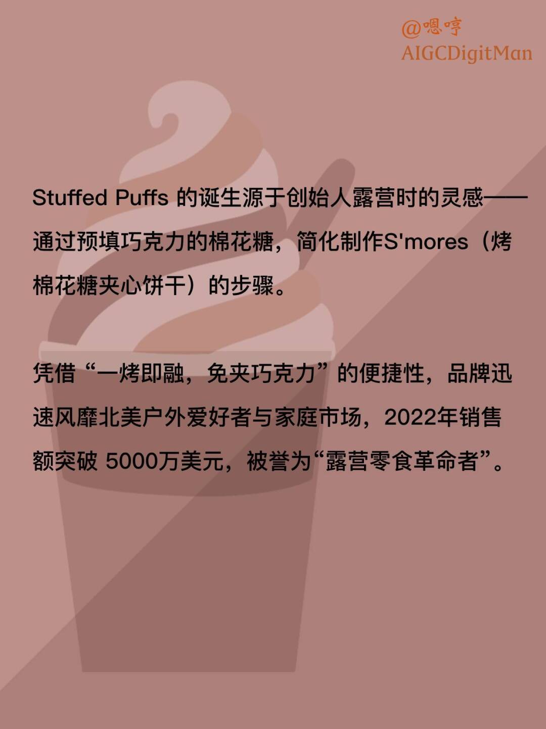 品牌以 “颠覆传统S'mores体验” 为核心理念,首创 “巧克力夹心棉花糖”,将原本需分开携带的棉花糖与巧克力合二为一,成为露营、派对场景的爆款零食。