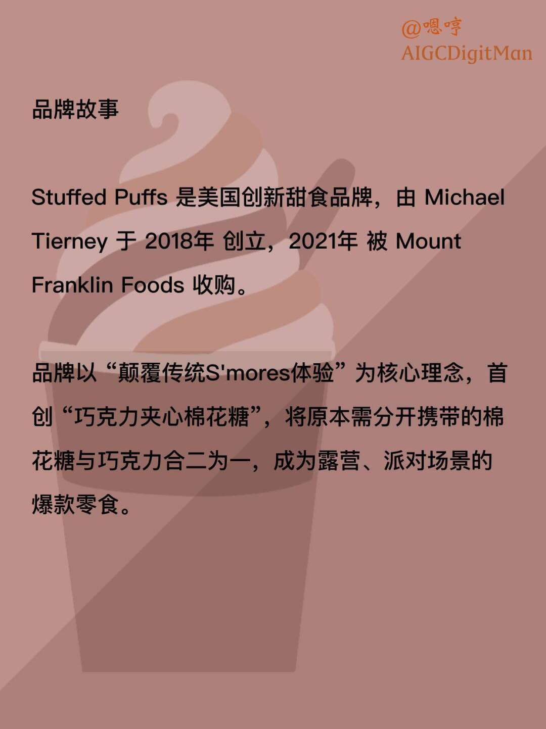 Stuffed Puffs 是美国创新甜食品牌,由 Michael Tierney 于 2018年 创立,2021年 被 Mount Franklin Foods 收购。