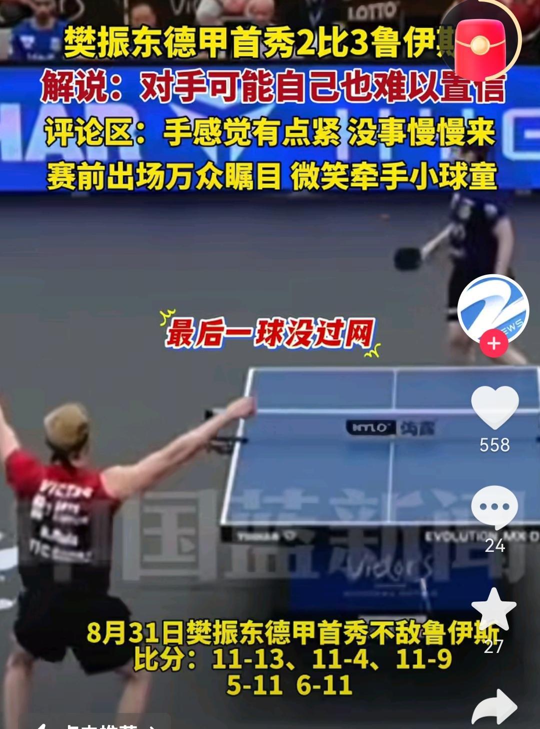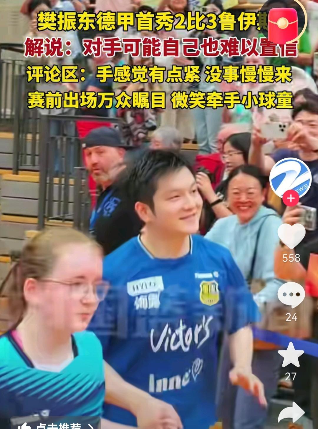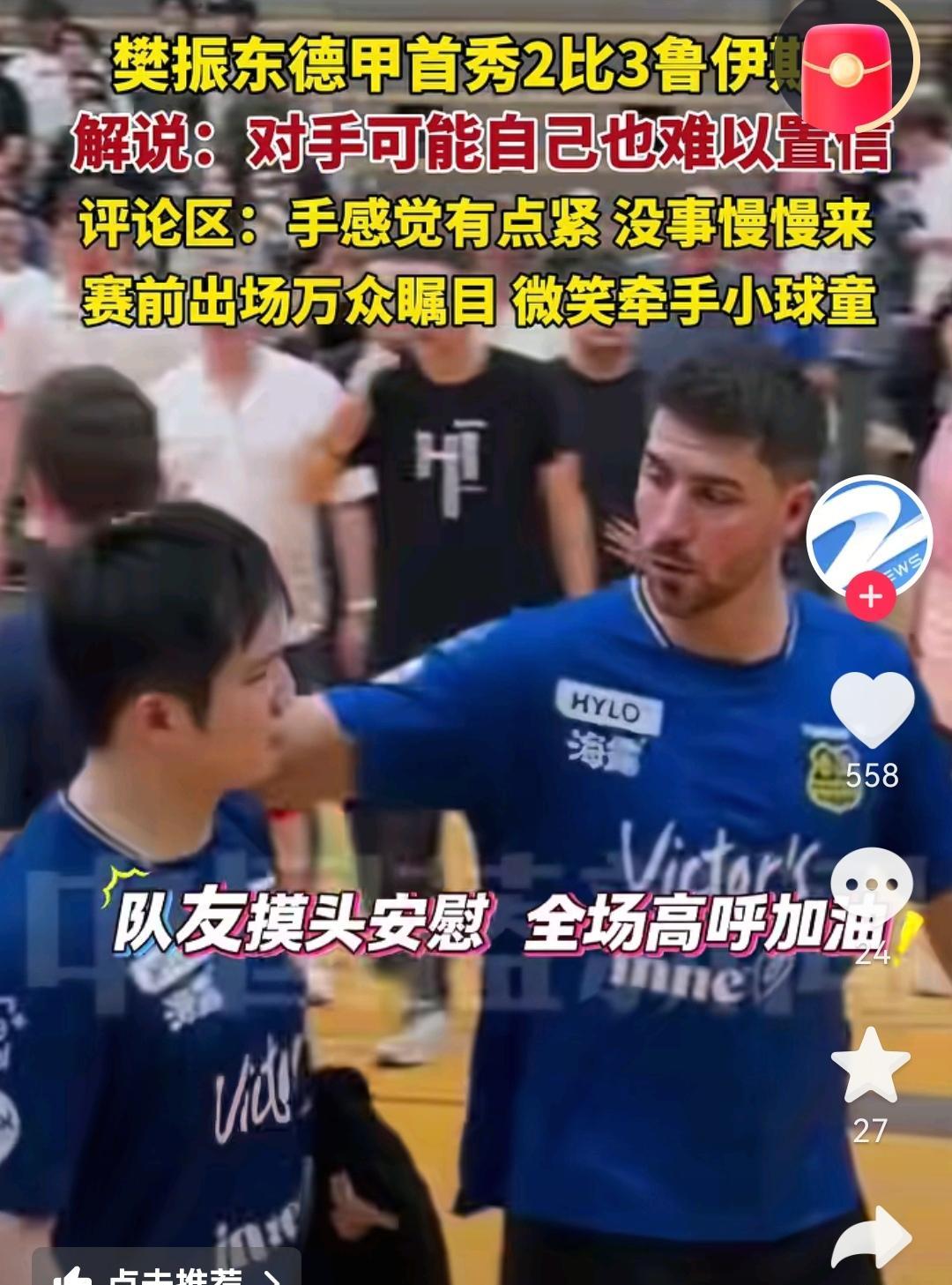 小胖和大头这两兄弟是不是心有灵犀,好兄弟有事大家共同分担,这边王楚钦乒超联赛王楚钦被徐瑛彬终结了单打13连胜的记录,那边德国樊振东的德甲首秀2:3负于无名之辈鲁伊斯。 赛后走出直播间的画面,看到王楚钦依然谈笑风生,对呀!这不就是一场比赛嘛!没有必要太在意一时的输赢,球迷完全没有必要玻璃心。 刚刚走出王楚钦输球带来的心情不爽,再看德甲首秀小胖也输了,小胖的德甲首秀也是吸引了很多小胖的球迷和华人朋友到现场助阵,德甲比赛给小胖加油的中国声音非常清晰,没有开门红也没有关系,小胖的实力在那里,我们来日方长。 感谢小胖的德国萨尔布吕肯俱乐部的队长,弗朗西斯卡对小胖照顾有加,小胖输了比赛,弗朗西斯卡一直在摸头安慰小胖,这个大哥哥队长人品不错。 #晒图笔记大赛#
