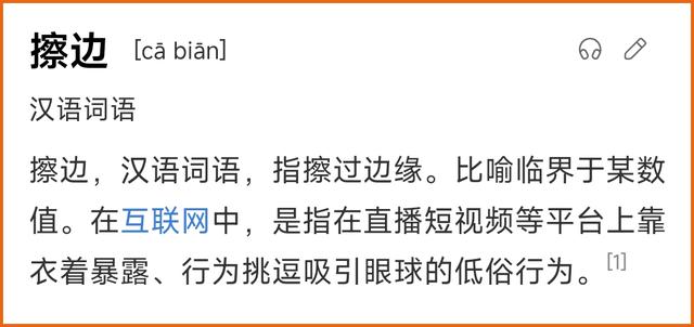 那么不妨来看看某百科对“擦边”的定义:在互联网中,是指在直播短视频等平台上靠衣着暴露、行为挑逗吸引眼球的低俗行为。