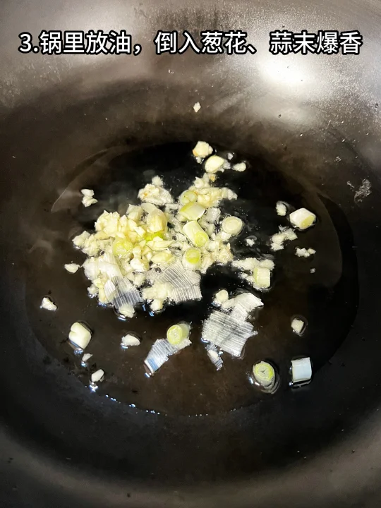 3、锅里放油,倒入葱花、蒜末爆香