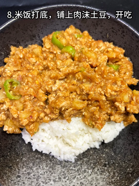 8、米饭打底,铺上肉沫土豆,开吃