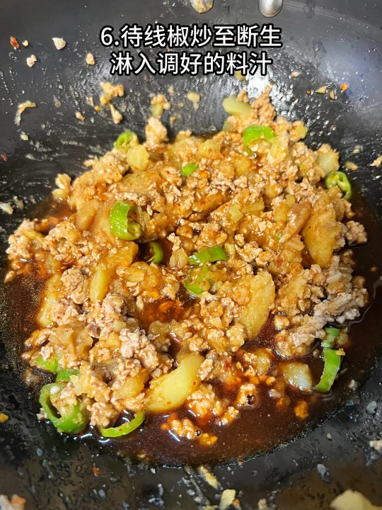 6、待线椒炒至断生,淋入调好的料汁