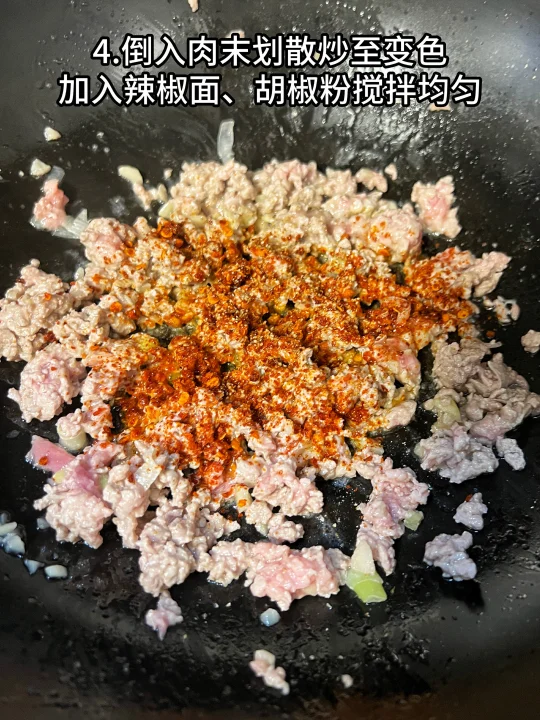 4、倒入肉末划散炒至变色,加入辣椒面、胡椒粉搅拌均匀