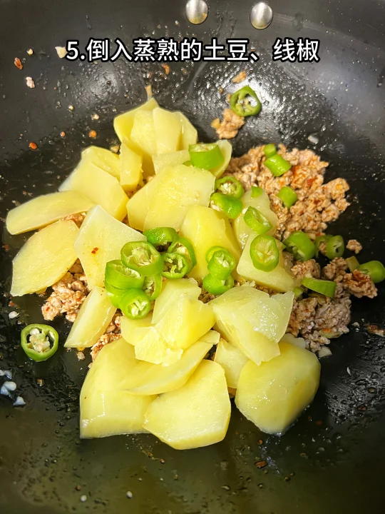5、倒入蒸熟的土豆、线椒