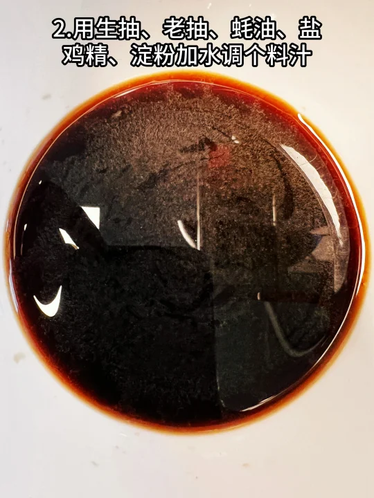 2、用生抽、老抽、蚝油、盐、鸡精、淀粉加水调个料汁