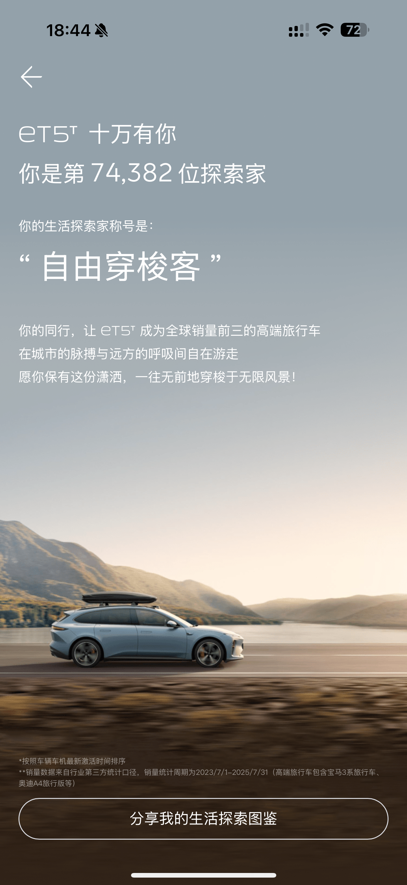 有些数据还蛮巧合有趣的,什么404、什么520,最终匹配给我的称号是“自由穿梭客”,很符合当初选蔚来ET5T的设想,就是说走就走!