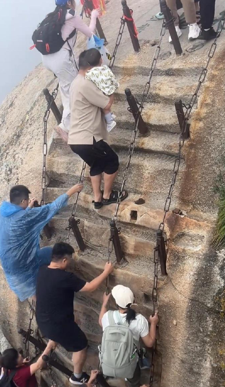 单手抱个孩子爬华山,这是对孩子的极不负责啊,只能说他不敬重生命。