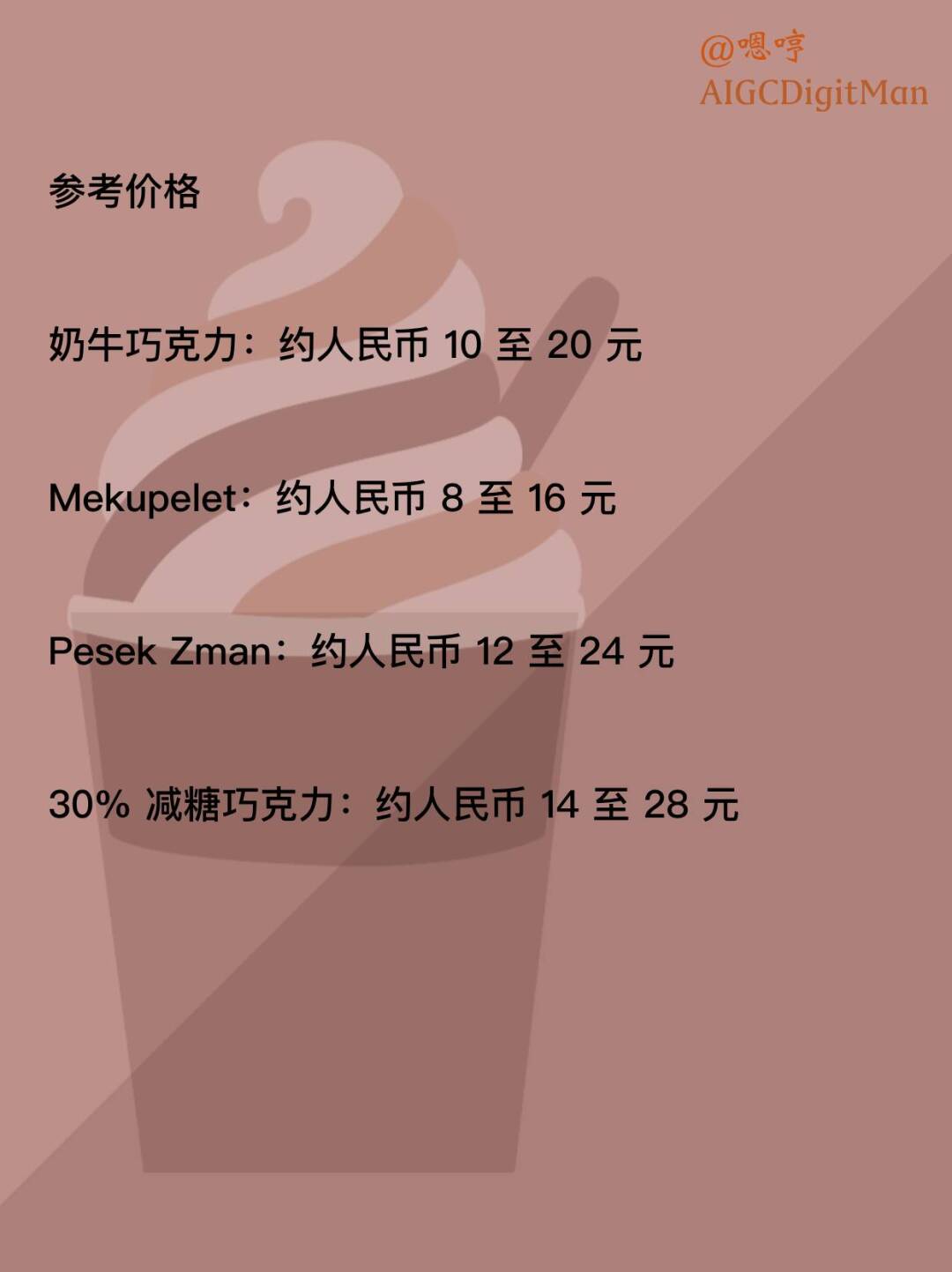 奶牛巧克力:约 人民币 10 至 20 元