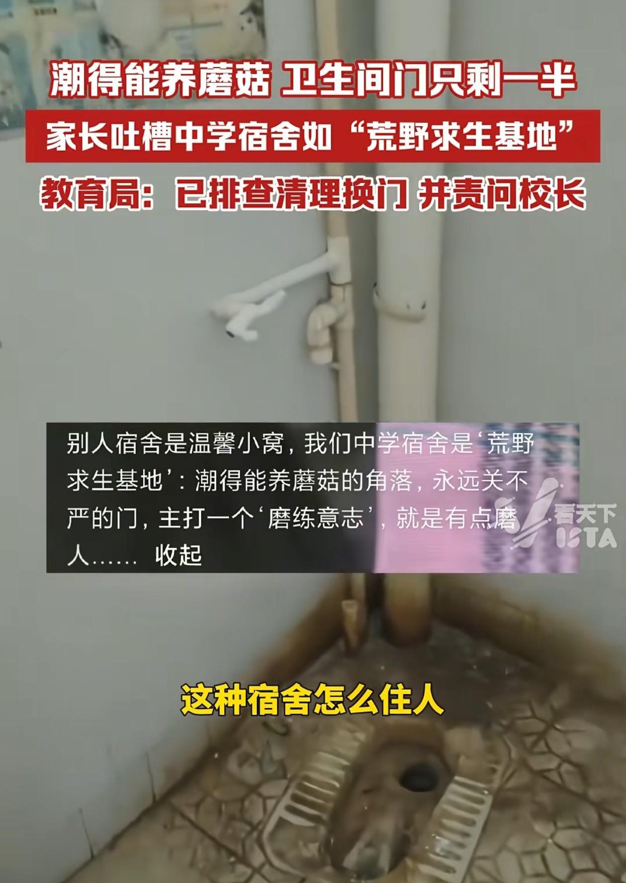 校长的后槽牙估计都咬碎了!9月1日,新生开学,广西一家长送孩子去学校报到,到宿舍一看都惊呆了,整个宿舍不仅阴暗潮湿,连厕所门都只剩一个门框,卫生间地面也是一层厚厚的垢,家长吐槽简直没法住人。 学校经费不足,没有空调可以忍,没铺瓷砖是水泥地也能接受,但是连卫生间门破了都不换,难道开学前,学校领导老师都不去宿舍检查一下,这种环境能住人吗? 目前,教育局已对校长进行问责,并立即安排人员对宿舍进行了打扫,破损的门也进行了更换。 我估计校长几年都没进过宿舍检查,都是坐在办公室吹空调,从不管后勤,也不关心孩子们的身心健康,如果不被曝光,永远都不会整改!