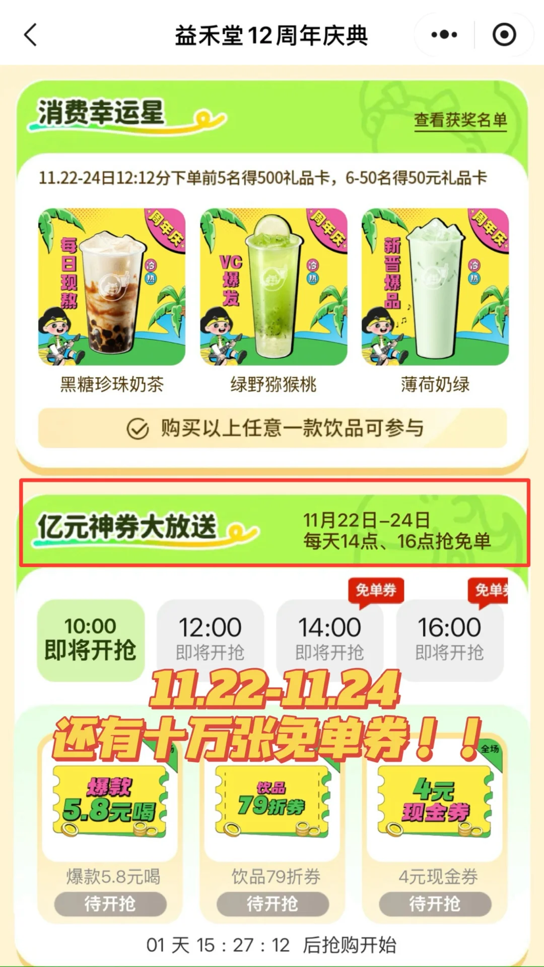 12 点 12 分下单爆品奶茶:薄荷奶绿、黑糖珍珠奶茶、绿野泥猴桃,还有机会赢百元大礼!!