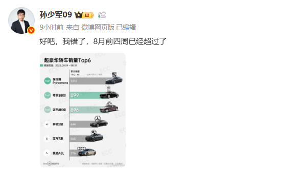 孙少军: 我错了,8月尊界就已超过奔驰宝马奥迪了!