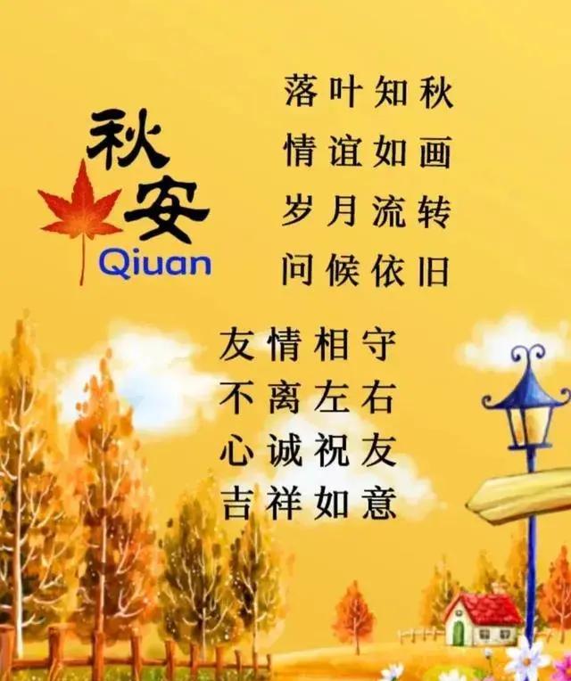秋风带来浓秋意 最喜斑斓秋色季 秋阳明媚照山川 朝霞绚烂东山起 秋风拂过树枝摇 一叶知秋随风飘 瓜果飘香秋韵浓 丰收在望好运绕 秋日祝福暖心间 一年四季常挂念 但愿彼此风雨顺 生活幸福比蜜甜 岁月悠悠季更新 又沐秋雨秋意深 秋日山水如画卷 常使游人赋诗情