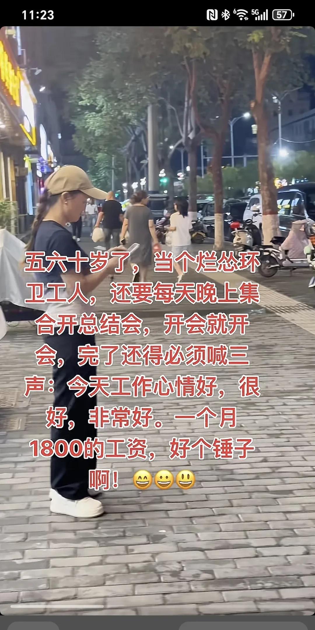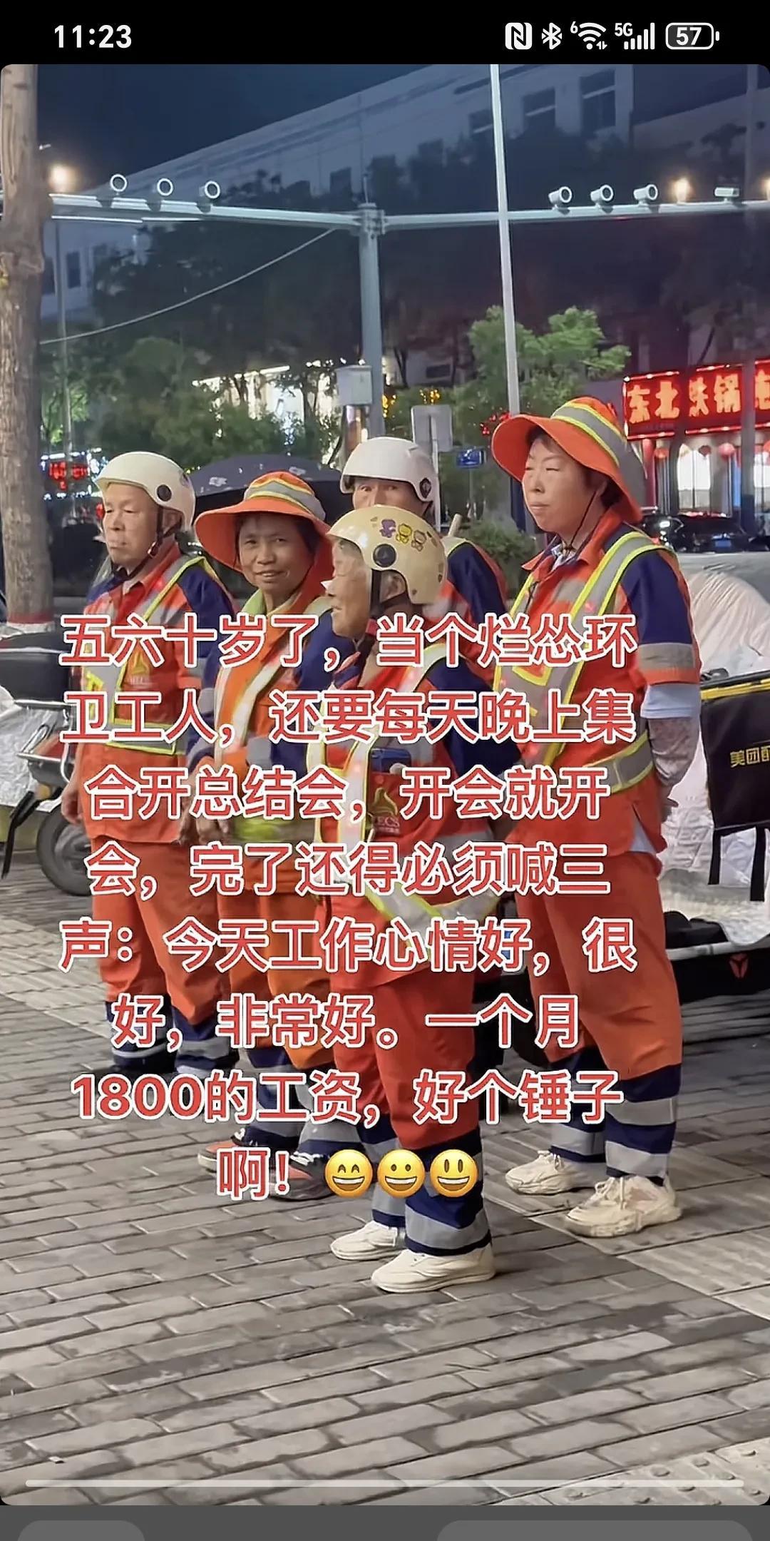 五六十岁了,当了个烂怂环卫工人,还要每天晚上集合开会总结会,完了还得必须喊三声:今天工作心情好,很好,非常好。一个月1800的工资,好个锤子啊~ 干力所能及的事,挣一点是一点,不给子女添麻烦。 一个孙子辈指挥一帮奶奶辈干活,发家致富赚了钱还是给孙子花。 干最脏的活,挣最小的钱,还得说最高兴的话。 这就是年轻时养了一群孙子,孙子长了说你老了,去给我扫地,我给你发钱。老了还要看孙子脸色,难搞哦[呲牙][呲牙][呲牙]#环卫工阿姨# #环卫工人困境# #清洁工老人#