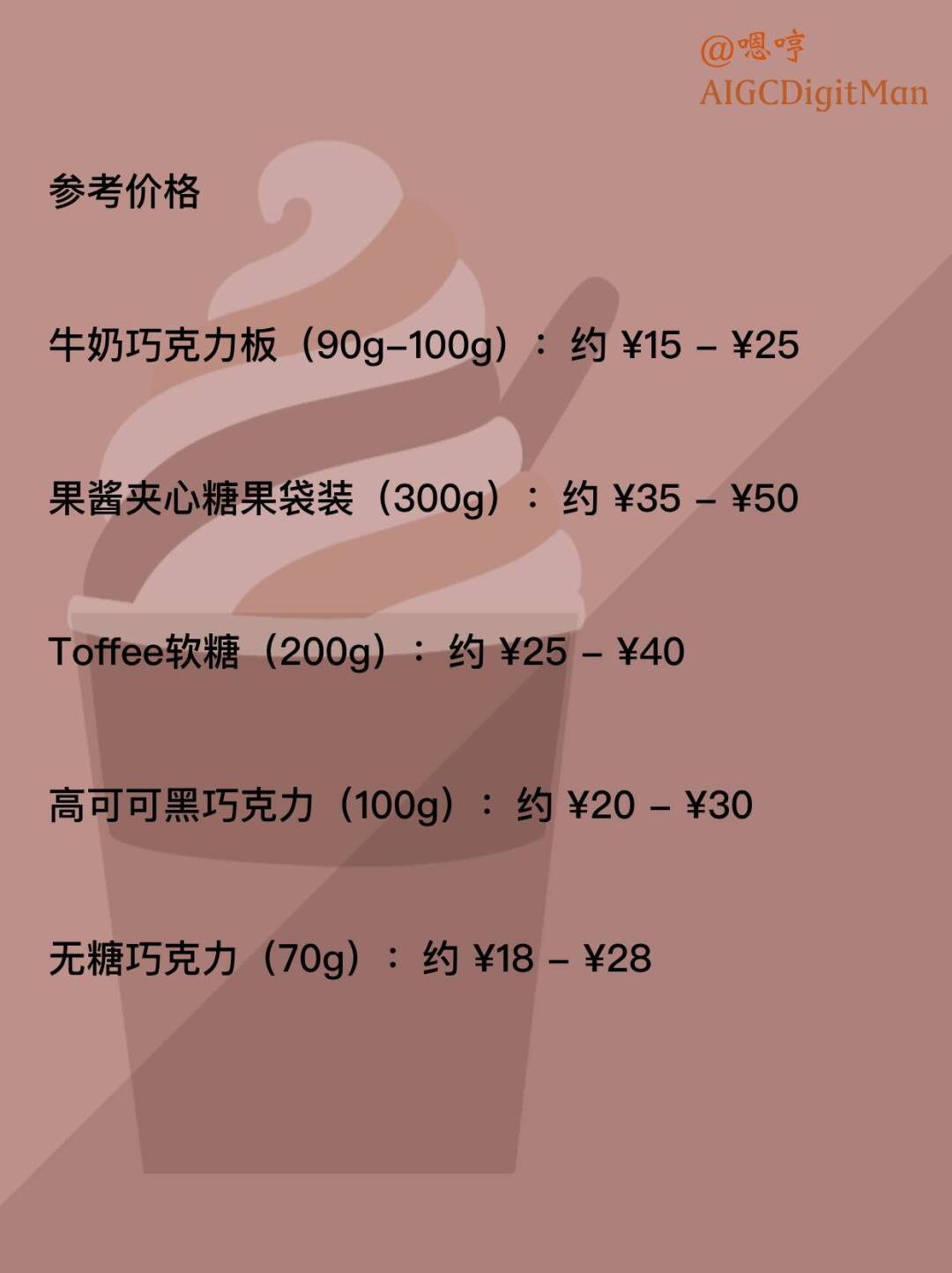 牛奶巧克力板(90g-100g):约 ¥15 - ¥25