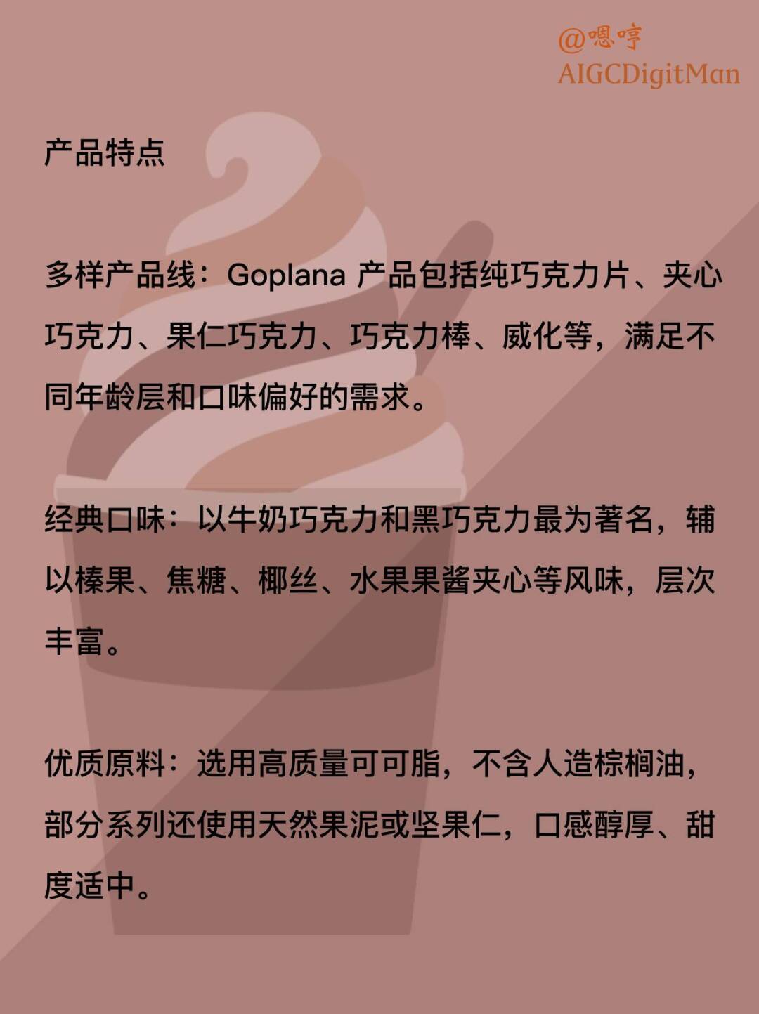 多样产品线:Goplana 产品包括纯巧克力片、夹心巧克力、果仁巧克力、巧克力棒、威化等,满足不同年龄层和口味偏好的需求。