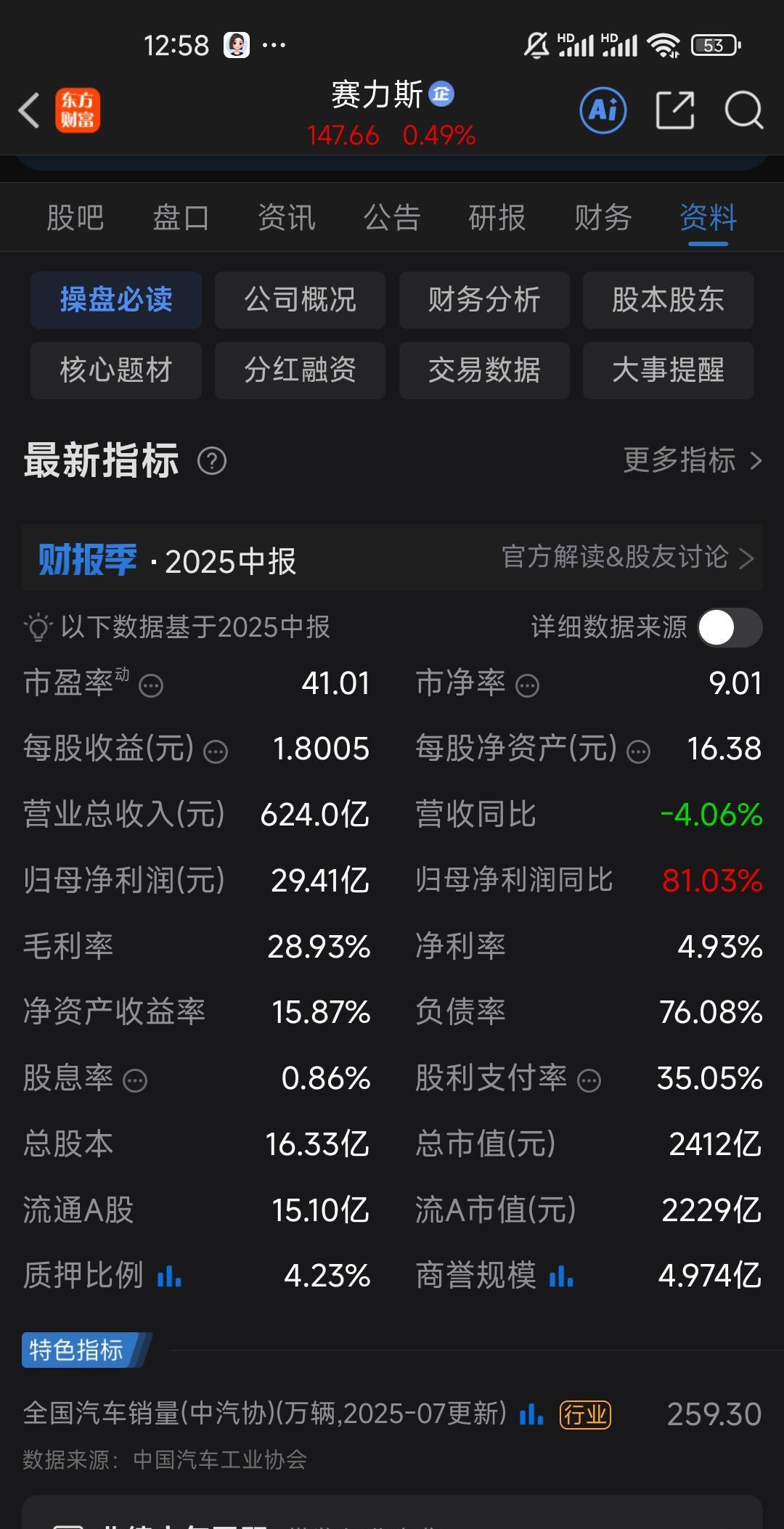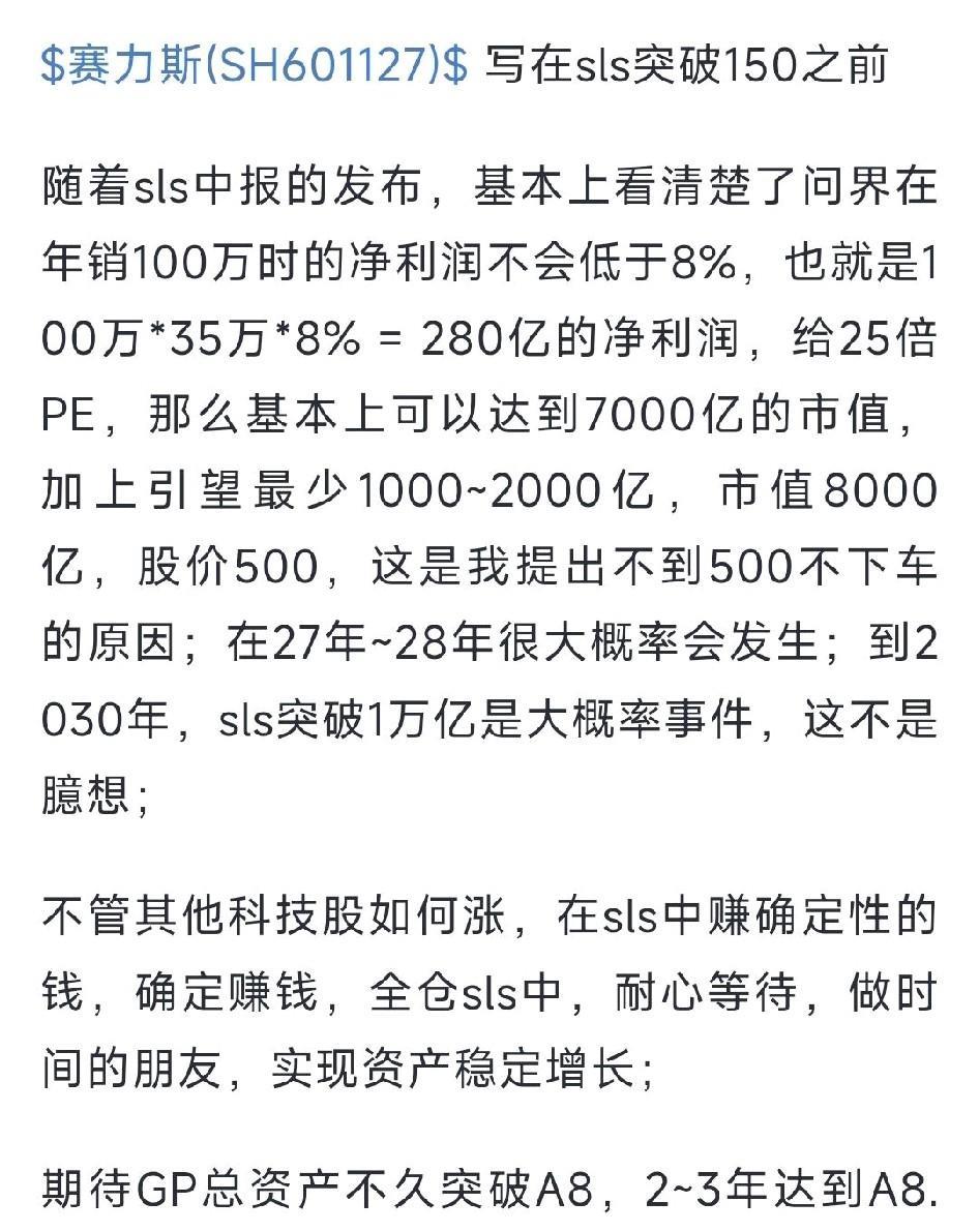 赛力斯 没钱买它了, 120多块钱的时候我就看好, 坚信横盘越久, 越有价值, 价值越低估。如今,轻舟已过万重山,创出一年的盘整期,历史新高。伴随的是业绩同比大幅增长。如果说有什么确定性的,我认为赛力斯就是确定性的。我要是有100万,这是我认为能够稳赚不赔的。也许,对于大资金而言,要的是稳定,资金体量越大,越不要频繁追涨杀跌,追热点,热点看起来短期会涨幅很大,可是,没有基本面的支撑,对公司不够了解。一旦套牢,就很难解套。而一旦亏损,将很难上岸。 如果你有1,000万,一个亿。资金体量越大。光买卖的手续费都是一笔不小的数字。所以如果我有很多钱,大概只会买类似于这样,公司能够业绩稳定增长,有护城河。哪怕涨得慢,哪怕调整。哪怕滞涨。哪怕错失一个又一个大牛股。只要确保正向收益就行了。 赛力斯 问界8 交付不断登顶, 刘亦菲做的广告。想当初,赛力斯刚开始上涨的时候,还只是一个传说。谁能想到,短短数年,这个传说变成了传奇。 赛力斯与华为合作,华为与赛力斯创造的品牌赛力斯,走出国门。以前的宝马,都被我们的赛力斯远远超越了。 赛力斯的背后,就是中国的科技强国。中国制造走出国门,走向全世界。可惜没有钱,没有本金,对我而言,又是一个望洋兴叹。 在此记录一下自己的看法。以待未来验证。虽然我没有钱,没有资本金的实力,但是我可以有观点。 本人不做任何股票推荐,股市中充满了变数。也不对任何人负责。投资要有独立思考的能力。千万不要人云亦云,不要听别人说。 就如同《天道》里的芮小丹所说:“只有我觉道的,悟道的才是属于我的,否则别人给我的也不属于我的。” #炒股那么多年,你悟到了哪些道理#