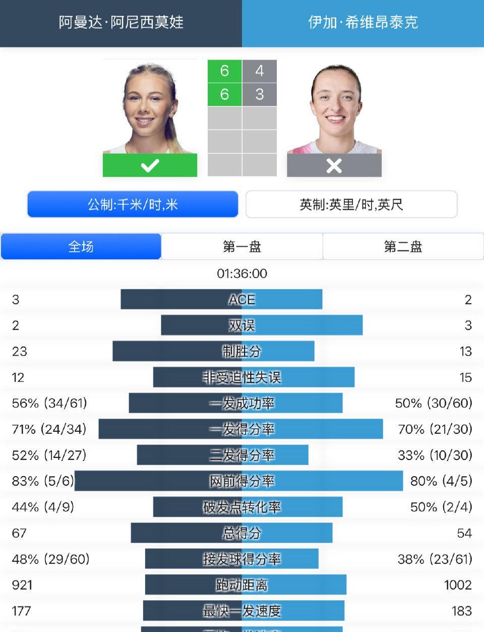 2025温网决赛,阿尼西莫娃0-6/0-6斯瓦泰克。 2025美网1/4决赛,阿尼西莫娃6-4/6-3斯瓦泰克。 有时候比分真的体现不出实力,阿尼西莫娃今天克服了心理障碍,轰出23个制胜分拿下比赛。