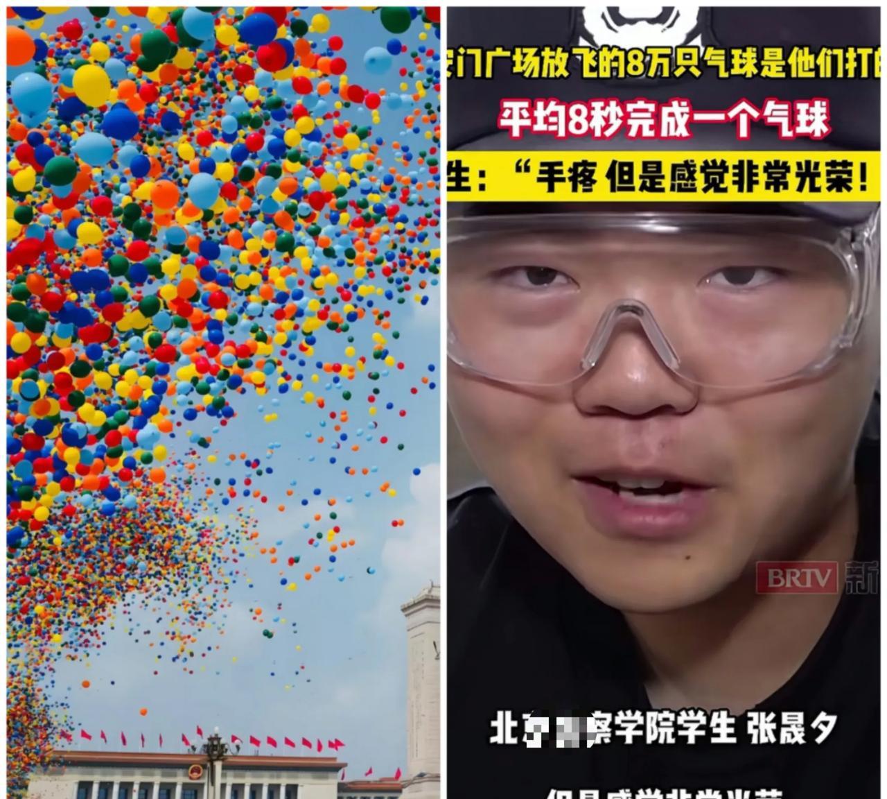 这下出名了 不仅北京,全国人民都知道了 万万没有想到,这八万个气球,居然是警/察学院 600 名师生通过两个月的训练,一个一个手打的! 用的是可降解的纯天然乳胶材质,打的也是无公害的氦气! 他们需要在阅兵仪式当天,在 90分钟之内,打出8万只气球,平均每一只气球的用时在8秒钟! 学生们的手系气球都系烂掉了,记者问学生疼不疼,学生回答“疼,但是我很光荣,很骄傲”! 每一次重大活动的背后,都有非常多的人在默默付出,我们真的要为他们点个赞!