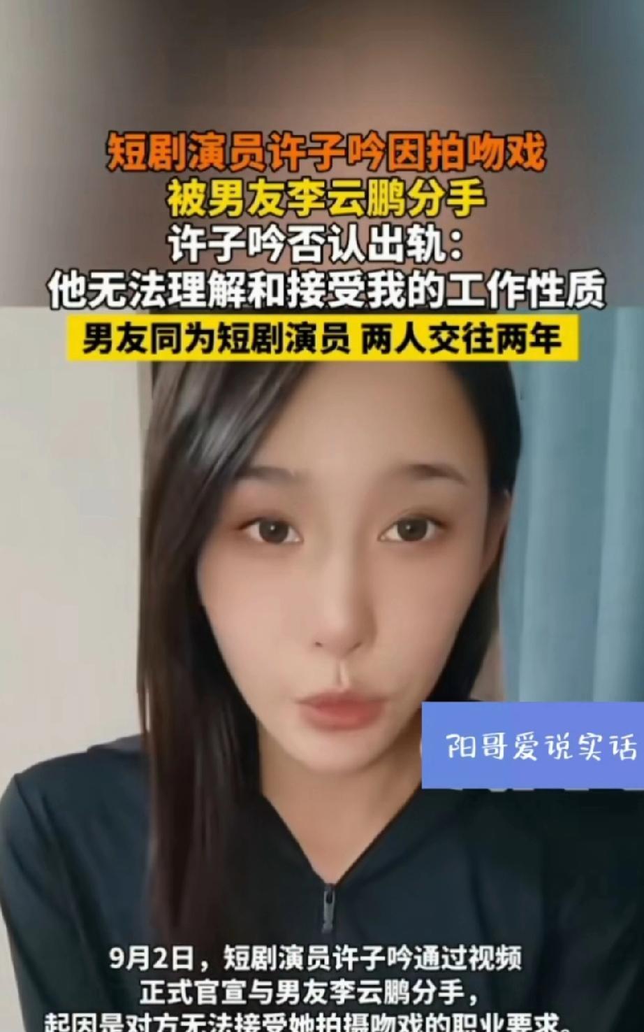 可以说,这是一位最无辜的女演员,就因为拍了一个吻戏,就被同样是短剧演员的男友提出分手。 最近,短剧演员许子呤就因为被导演安排拍了一场吻戏,就被同样是短剧演员的男朋友李云鹏提出了分手,可以是最无辜最让人心疼的了。 有网友表示,许子呤拍吻戏也是被导演安排的,更是一种职业素养,没想到她男朋友也是短剧演员还居然不能够理解,可见,现在的短剧市场存在多么让人不能理解的猫腻行为。 而且现在的人也不是像过去那么传统好奇,现在看到吻戏场面,反而会让人感到一种恶心,一般都会迅速把该场景划过。 正如这位网友所说,有些导演真的不够资格,素质太差,在剧情安排当中顾意想方设法的变相折磨短剧女演员,就跟赵露思事件一样,让人不可理喻。 恋爱双方只能相互理解,才能够相走的长远。