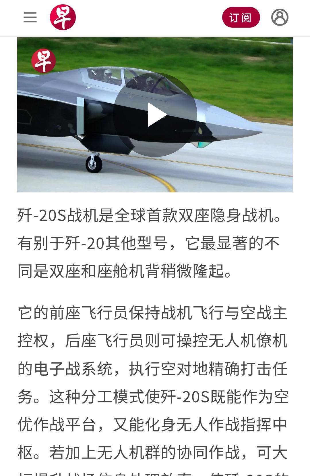 外媒:歼20S的战力远超其他五代隐身战机。 嗅觉相当敏锐,歼20S一亮相九三阅兵式,外媒就觉察到了她的不凡之处:经过改进升级后,其战力上更上一层楼。 与其他五代机不同的是,歼20s可以指挥无人机群进行作战。也就是说,歼20S不再是一架“单打独斗”的战斗机,而是一个移动的空中指挥平台,其能够同时调度多架僚机进行协同作战,对空中和地面等目标进行降维打击。 这种“有人机+无人机”体系化作战模式,大大的提高作了作效率。对方面对的不再是一架飞机,而是一张突然出现、难以捕捉的空中火力网。 “五七”空战让外界见识到了歼10CE战力。由此推断歼20S的强大,说她是一架足以改变未来空战格局的飞机都不为过…
