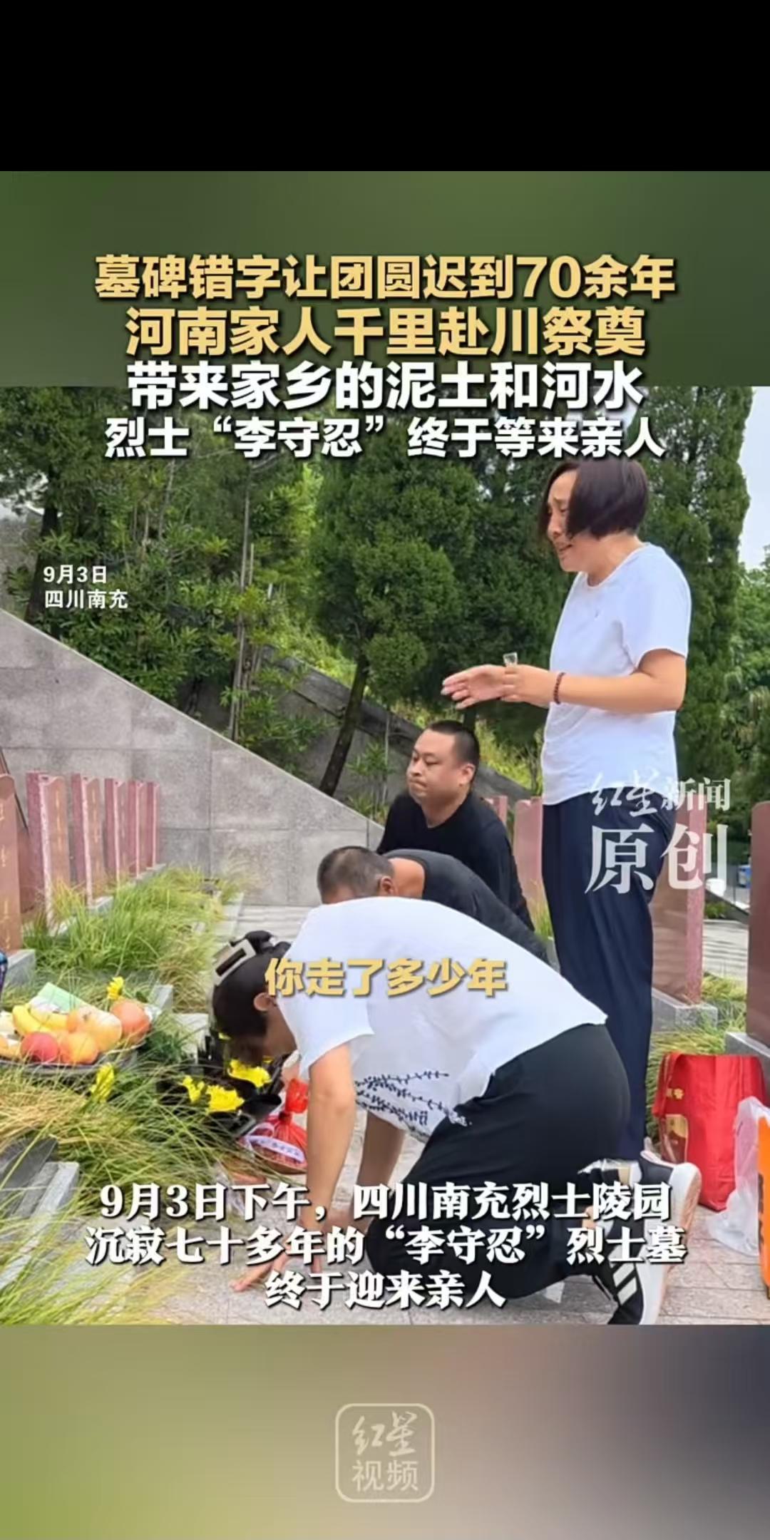 四川南充,“李守仁”被写成“李守忍”。就因这一字之差,一家三代花了整整七十年,才终于在四川南充烈士陵园的墓碑前,找到了这位1949年牺牲在“三台战役”中的烈士。 2025年9月3日下午,四川南充烈士陵园的银杏叶落了一地。吴楠蹲在一座墓碑前,慢慢将从河南荥阳老家带来的泥土撒在墓基上——泥土里混着黄河边的沙粒,是他特意从祖辈老宅墙角挖来的。 墓碑上刻着“李守忍”三个字,他指尖反复摩挲着那个“忍”字,喉咙发紧:这是他一家三代找了七十年的人,只是名字,本该是“李守仁”。 故事要从1949年说起。那年,吴楠的爷爷有个弟弟叫李守仁,刚满二十岁,是村里少有的读过书的青年。 某天清晨,李守仁背着蓝布行囊出门,蹲下身揉了揉侄子(也就是吴楠的父亲)的头,笑盈盈地说:“等叔叔打了胜仗回来,给你带糖吃。” 那时吴楠的父亲才五岁,攥着李守仁的衣角不肯放,直到他转身走进晨雾里。 这是父亲对这位叔叔最深的记忆——后来无数个夜晚,父亲总跟吴楠念叨:“你叔公走那天,太阳刚出来,他背影亮堂堂的。” 同年冬天,部队的消息传到村里:李守仁在四川“三台战役”中失踪,后被追认为烈士。可档案上只有一句“牺牲于三台地区,就地安葬”,连具体墓地在哪都没写。 李守仁的父母,也就是吴楠的太爷爷、太奶奶,揣着那张薄薄的烈士证明,每年都在村口老槐树下等。 太奶奶临终前攥着李守仁少年时的照片,一遍遍问:“我儿是不是记错路了?咋还不回?” 吴楠的父亲长大后,成了家里第二个“寻亲者”。他跑遍河南、四川的档案馆,逢人就问“有没有听过1949年三台战役牺牲的李守仁”,笔记本记满了厚厚一本,却总找不到线索。 “那时候没电脑,全靠腿跑,”父亲跟吴楠说,“你叔公是英雄,不能让他就这么‘没影’了。” 多年前,吴楠接过了接力棒。他把档案里的信息录入电脑,比对全国烈士陵园的电子名录,这一找就是十年。 档案里“李守仁”三个字被他看了无数遍,连笔画走势都记在了心里。 转机出现在2025年8月。南充烈士陵园开展烈士信息核对,工作人员发现“李守忍”的档案有蹊跷:籍贯“河南荥阳”、牺牲时间“1949年11月”都和三台战役对得上,唯独“忍”字有明显涂改痕迹。 试着改成“李守仁”检索时,系统瞬间跳出了吴楠十年前登记的寻亲信息。 接到电话那天,吴楠正在黄河边给太爷爷、太奶奶上坟。他举着手机往河边跑,对着湍急的河水喊:“找到了!爸,叔公找到了!” 电话那头,父亲哭了,说:“你太爷爷、太奶奶要是知道,该笑了。” 出发去四川前,吴楠装了一瓶黄河水,又挖了袋老家的泥土。父亲跟他说,李守仁小时候总爱在黄河边摸鱼,说“这水亲,走到哪儿都忘不了”。 如今,他要把这水和土放在叔公墓前,让他闻闻家乡的味道。 墓碑前,吴楠摆上了荥阳的柿饼和花生——这些都是父亲说叔叔生前爱吃的。 他拿出软布,轻轻擦着“李守忍”三个字,轻声说:“叔公,等改了名字,我就把你的故事刻在这儿。让来的人都知道,你是河南荥阳的李守仁,是我们家的英雄。” 风卷着银杏叶落在墓前,像轻轻的拥抱。七十多年前那个清晨,青年李守仁转身的背影,终于和三代人的牵挂,在这一刻遇合了。 一、李守仁烈士能否迁回当地烈士陵园? 根据《烈士安葬办法》,烈士可在牺牲地、生前户籍所在地、遗属户籍所在地或生前工作单位所在地安葬;确定安葬地后,就近在当地烈士陵园或烈士集中安葬墓区安葬。 李守仁烈士已安葬于四川南充烈士陵园,而规定明确,烈士在烈士陵园或烈士集中安葬墓区安葬后,原则上不迁葬。 若其家属希望将李守仁烈士迁回当地烈士陵园,需向相关退役军人工作主管部门提出申请,说明迁葬的必要性和合理原因(如家族祭扫需求等),由县级以上地方人民政府退役军人工作主管部门根据实际情况考量,在征得烈士遗属同意后,决定是否就近迁入当地烈士陵园。 二、李守仁烈士家属能享受哪些优待? 根据《烈士褒扬条例》,烈士遗属可获得烈士褒扬金,标准为烈士牺牲时上一年度全国城镇居民人均可支配收入的30倍。 若李守仁烈士属于《军人抚恤优待条例》适用范围,遗属还能享受一次性抚恤金,标准为烈士牺牲时上一年度全国城镇居民人均可支配收入的20倍加本人40个月的工资。 从目前情况来看,公开信息中主要出现了李守仁烈士的侄外孙吴楠参与寻亲与祭扫,暂未提及直系亲属。 不过,吴楠作为亲属参与守护烈士记忆的举动,也让这份跨越七十余年的牵挂有了温暖的落点;而烈士的荣光与国家的优抚政策,始终是对英雄及其家人的郑重铭记。 对于这件事,大家又是如何看待的呢?文中人物均为化名,素材来源于红星新闻9月4日报道。