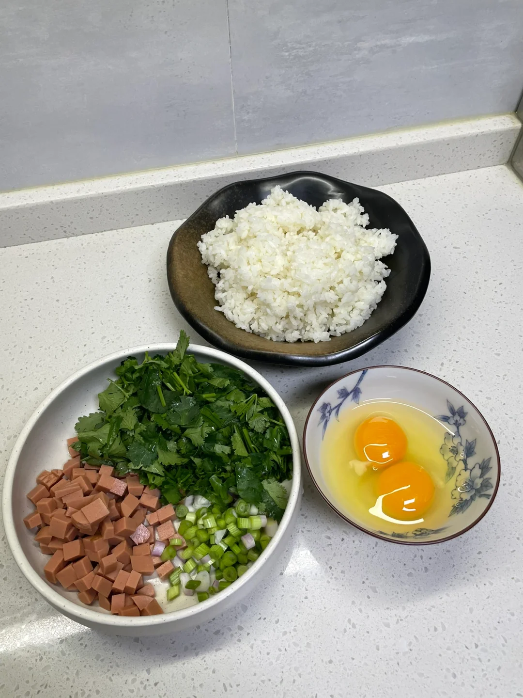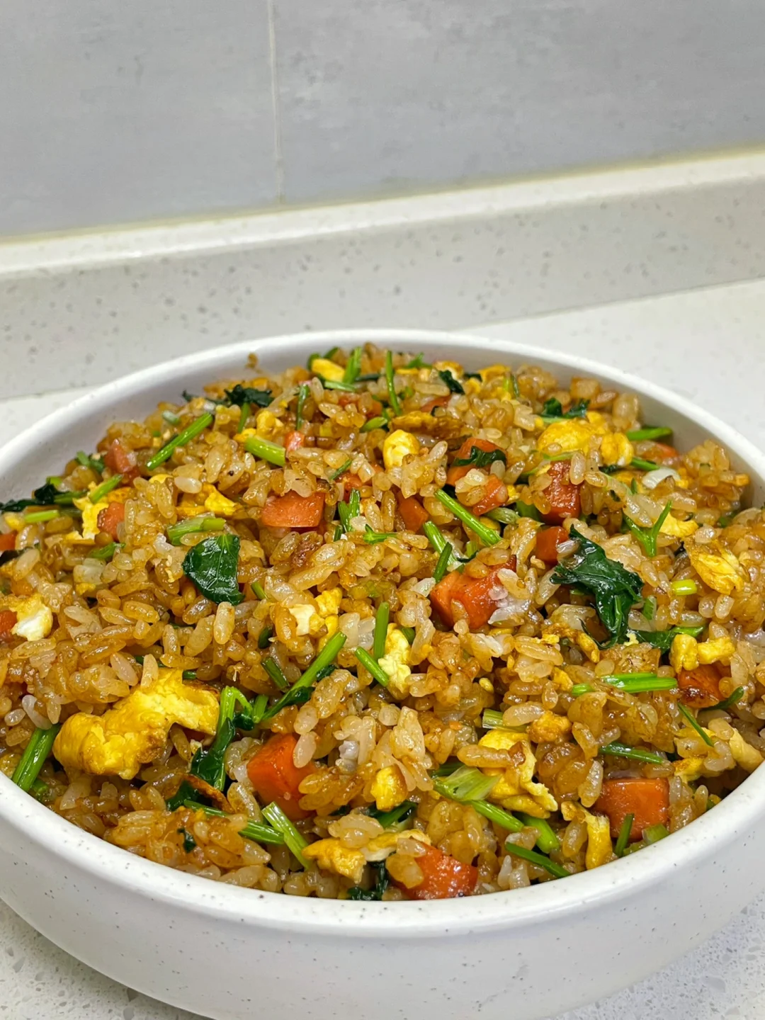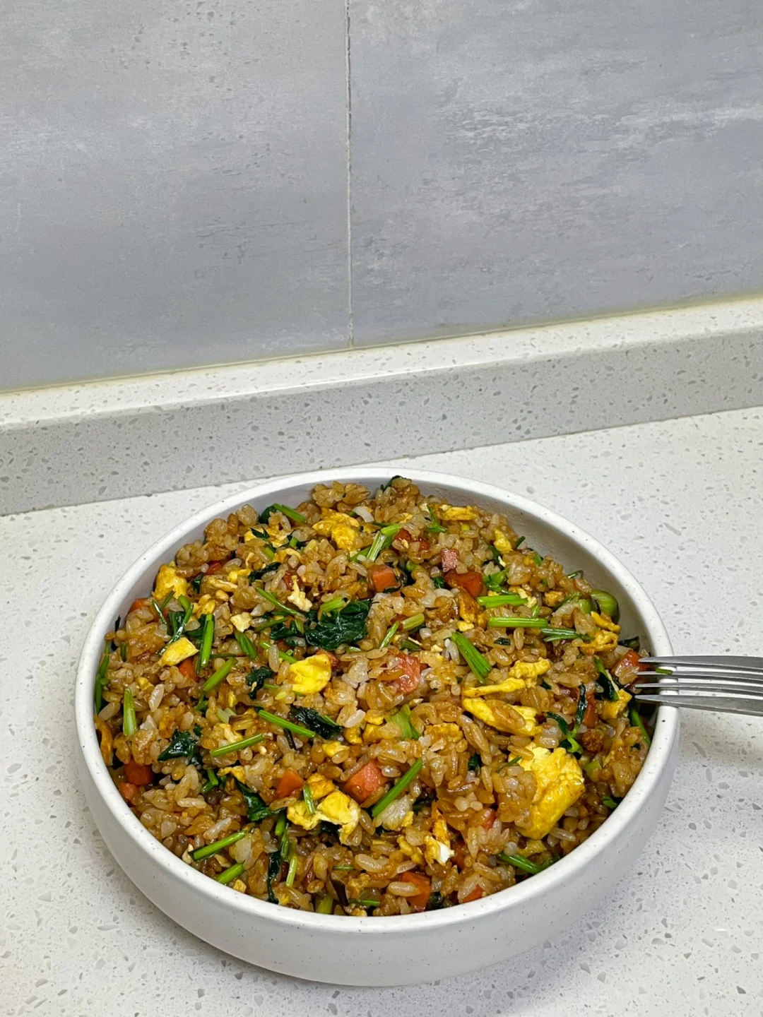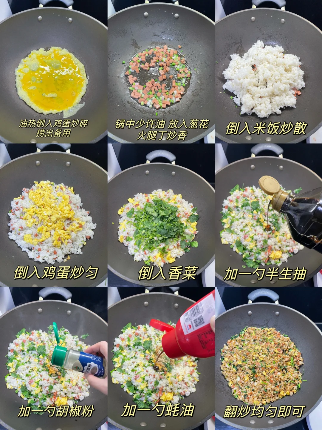 喜欢吃香菜的一定不要错过这个炒饭,只有试过了你才知道它有多香~ 食材:米饭 鸡蛋 香菜 火腿肠 配料:葱花 生抽 胡椒粉 蚝油 1⃣️:鸡蛋炒碎捞出,锅中少油,倒入葱花和火腿肠炒香,倒入米饭炒散,倒入鸡蛋炒匀,再倒入香菜,加一勺半生抽 一勺胡椒粉 一勺蚝油调味即可