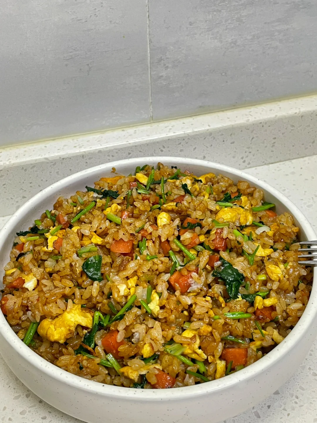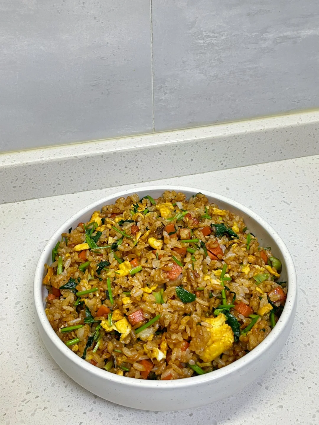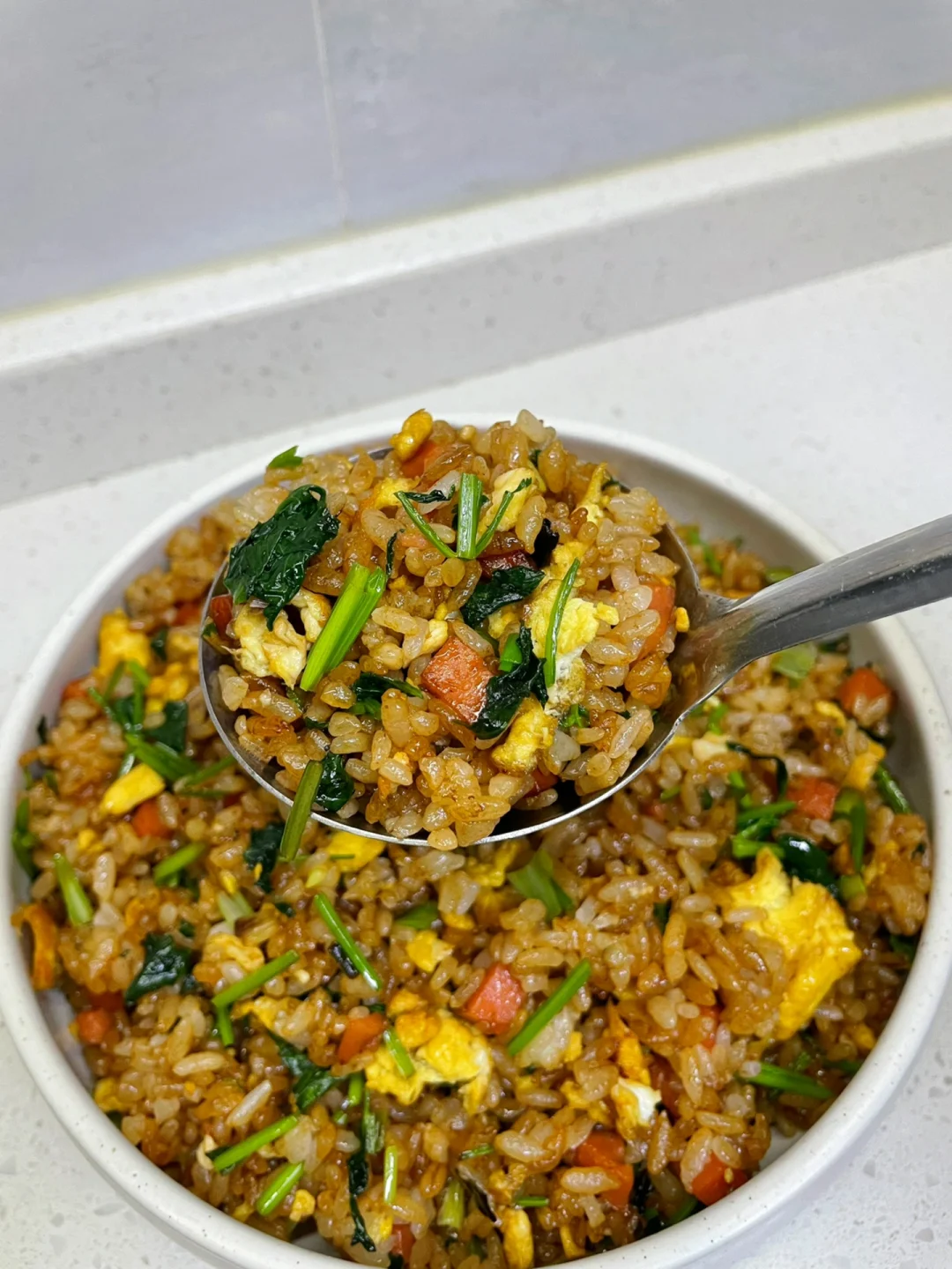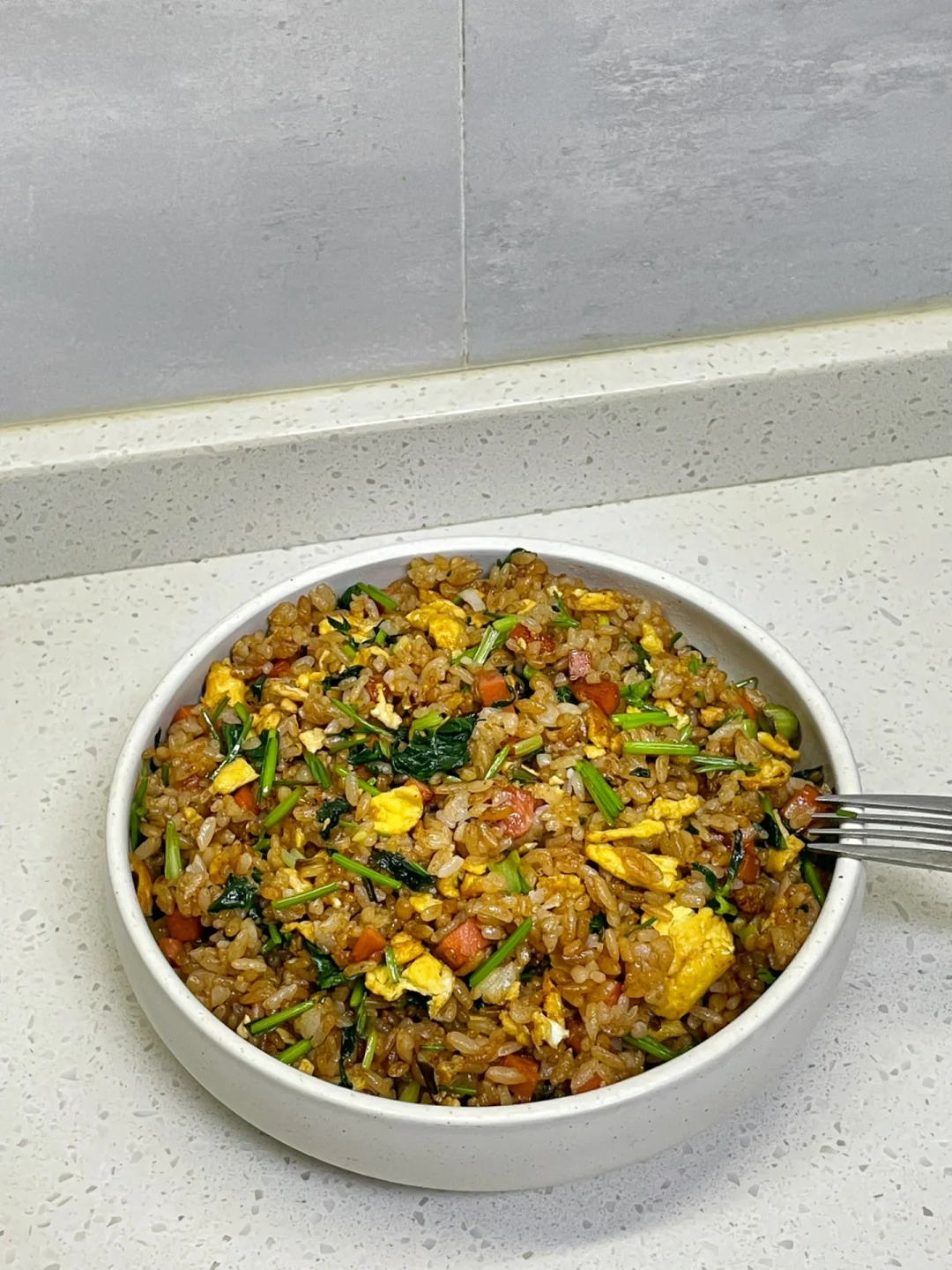 喜欢吃香菜的一定不要错过这个炒饭,只有试过了你才知道它有多香~ 食材:米饭 鸡蛋 香菜 火腿肠 配料:葱花 生抽 胡椒粉 蚝油 1⃣️:鸡蛋炒碎捞出,锅中少油,倒入葱花和火腿肠炒香,倒入米饭炒散,倒入鸡蛋炒匀,再倒入香菜,加一勺半生抽 一勺胡椒粉 一勺蚝油调味即可