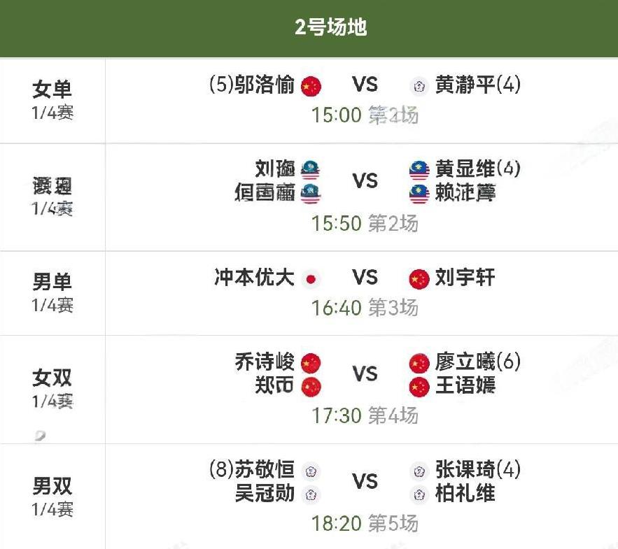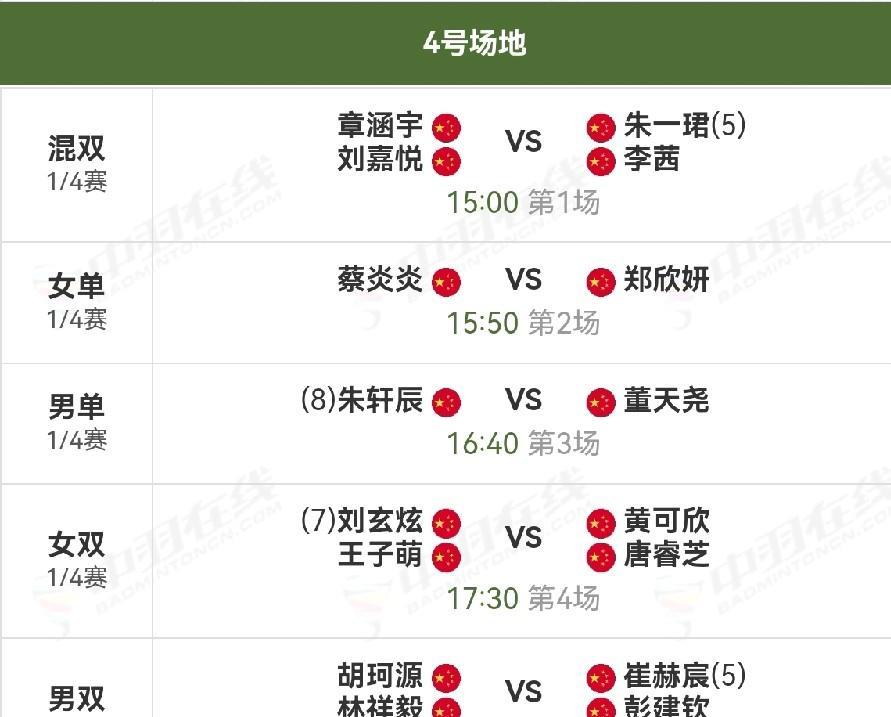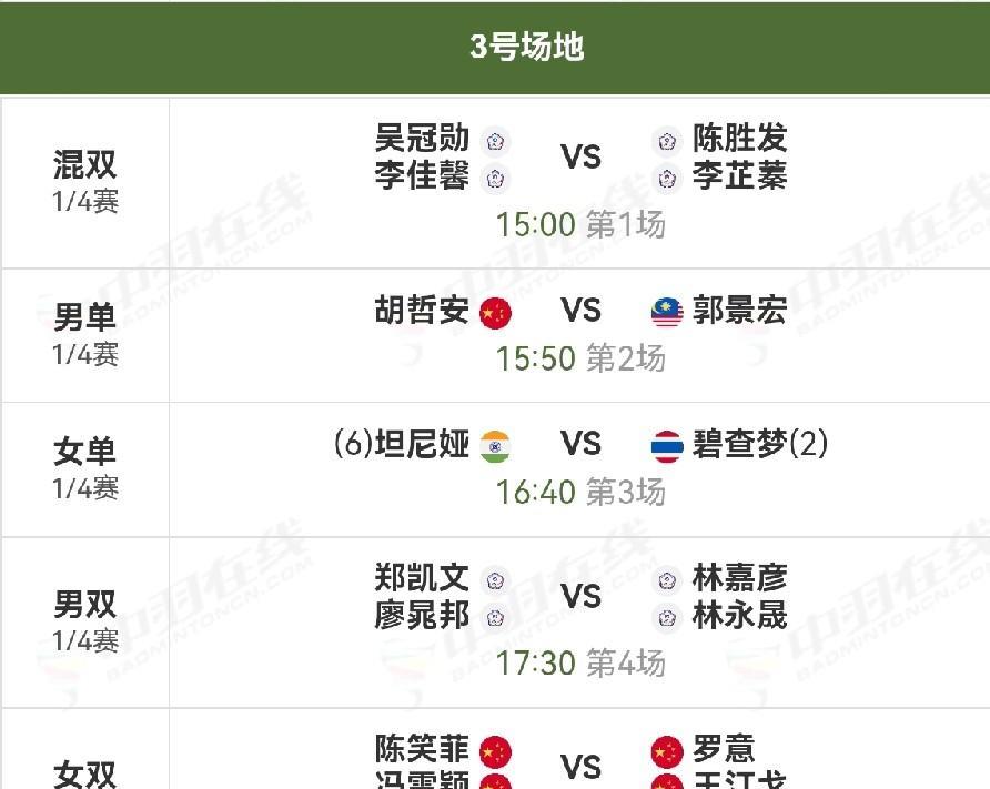 2025中国宝鸡羽毛球大师赛,1/4赛胡哲安对阵郭景宏,孙超对阵陈家杰,徐文婧对阵黄宥薰,还将进行多场内战。