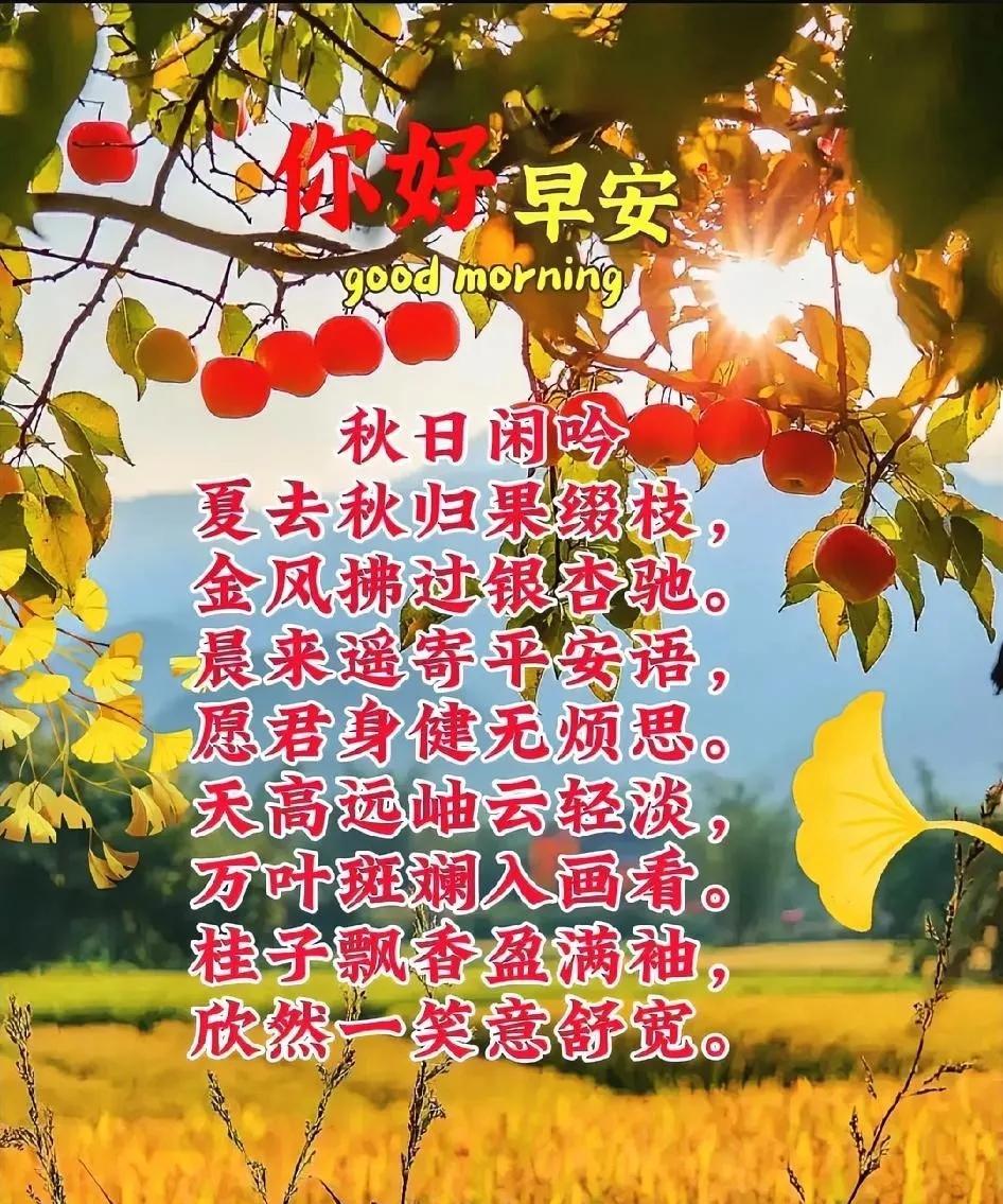 入秋以来草木黄 片片枫叶呈吉祥 每季都有好景色 秋风抒写秋浪漫 清晨江滨沐秋风 又是斑斓秋相逢 平安喜乐好运连 福运财运来敲门 田园风光映窗台 丰收令人乐开怀 辛勤劳动有回报 五谷丰登真精彩 清晨梦醒祝早安 高高兴兴迎曙光 美好生活又开启 一帆风顺好运伴