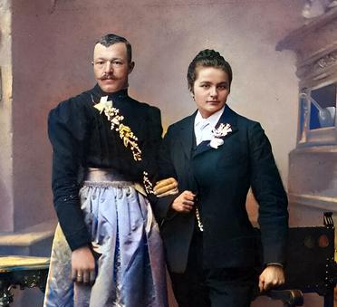 这是维多利亚时期夫妻俩到照相馆拍照。当时,夫妻俩在照相时还会进行角色互换。丈夫会穿上妻子平时穿的女装,而妻子也会换上丈夫日常中的服装。 为了能表现得淋漓尽致,夫妻俩不仅要在着装上互换,还要在动作与表情上体现出来。丈夫穿上裙装后动作拘谨,一脸羞涩,而妻子穿上西装后昂首挺胸,自信满满。丈夫羞答答的挎着妻子的胳臂。 如今,夫妻这样的角色互换会令人忍俊不禁。过去夫妻这样的角色互换会令人震惊不已。因为在过去,欧洲并没有明文禁止男人穿女装,但明确禁止女人只能穿裙子而不能穿裤子。因此,女人也只有在照相馆里穿裤子过过瘾,却不能穿着裤子走在大街上。当然,夫妻俩能进行角色互换也是一种大胆尝试。