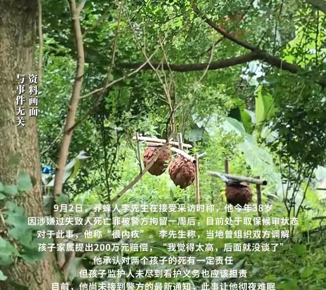 被蜂群蛰死的云南兄妹是留守儿童,当天老人带他们去树林旁的地里干农活,兄妹进林玩耍,2岁妹妹被蛰700多下、7岁哥哥被蛰300多下,外婆听到哭喊声去救孩子,也被蛰伤住院,可怜两个小生命就此凋零! 事情发生在6月28日,暑期刚刚来临,兄妹俩一个7岁、一个2岁,哥哥读一年级、妹妹还没上幼儿园。为了养活一大家子,父母不得不背井离乡外出打工,兄妹俩平时跟外公外婆在云南老家生活。 农村人除了带孩子,平时还要种地,兄妹俩又都这么小,去地里干活时只能带着,让他们独自在家更加不安全、不放心。 蜂群并非是野生的,而是同村38岁李姓村民人为养殖的,一共10窝,就露天放在小树林里,无养殖许可证、无警示标志、无围栏,典型的三无作业。 实际上,兄妹父亲知晓李姓村民养蜂,但下意识的认为是养蜜蜂,平时也就卖卖蜂蜜啥的,殊不知对方养的是马蜂,卖给餐馆做食品原料或泡酒。 蜜蜂和马蜂的攻击力不可同日而语,马蜂个头很大、领地意识强、尾针毒性巨大、通常是群起而攻之,普通人蛰上几口就受不了,要去医院赶快就医,更何况是这么两个小孩子,被蛰上几百口,那画面的惨烈可想而知! 养蜂的小树林和兄妹家的庄稼地是紧挨在一起的,等到林中传出惨叫,外婆赶过去营救时,一切已经来不及。 妹妹抱出时已哭不出声,显然是人不行了,哥哥被蛰300多下,毒重不治去世,就连救孩子的外婆,也被蛰得去医院住了一周后才慢慢好转。 事发如此突然,等到远在杭州打工的父母赶回云南老家,2个孩子已经走了,没能见上最后一面。 事后,养蜂人主动赔偿4万,便再也没有经济能力给更多,他本人因涉嫌过失致人死亡罪被警方拘留一周后,取保候审。 区区4万元,怎能赔付2死1伤的惨剧,但养蜂人38岁,估计也是上有老下有小,靠着养蜂来赚点钱,家里应该的确拿不出太多财产。 《刑法》第233条规定了过失致人死亡罪,简单来说,就是主观上的过失,客观上的致人死亡结果,以及两者之间具有因果关系。违反此罪的,处3年以上7年以下有期徒刑。 10窝马蜂聚养在一起,有杀人的风险,其危险程度堪比毒蛇,这是成年人的常识。养马蜂小树林又是“三无”区域,并且紧挨着乡亲庄稼地,是在人类正常活动范围内。 养蜂人却盲目自信、疏忽大意,让2个无辜小孩被自己所养的马蜂蛰伤致死,警方以涉嫌过失致人死亡罪将其拘留便源自于此。 可养蜂人也觉得委屈,他觉得自己养蜂很久了,平时都没出什么事,肯定是孩子进林后故意捣蛋,这才被蛰身亡,所以作为监护人的外公外婆,没有尽到应有的看护义务。 “我不是故意的,他们是受害者,我也是!这件事毁了两个家庭。” 事情虽然已过去两个多月,因为没有得到彻底解决,养蜂人的心里也是战战兢兢、彻夜难眠。 网友们也纷纷分享了自己被蛰的经历和周围人养蜂的事实,有人甚至担心会步两兄妹的后尘! 不管怎么说,在别人家地旁无任何措施养马蜂,终究是理亏有错在先,即使这次不出事,将来指不定什么时候也会酿成大祸,防微杜渐、根治危险源才是上上之策。 最可怜的是兄妹俩父母,累死累活在外省打工,承受异地相思之苦,就是为了给两个孩子打拼出一个稳定美好的未来。如今一切全没了,白发人送黑发人,全身被痛苦的泥淖包裹,真不知将来夫妻俩该如何走出…… 【关注@小讼言案 ,为您分享更多精彩】