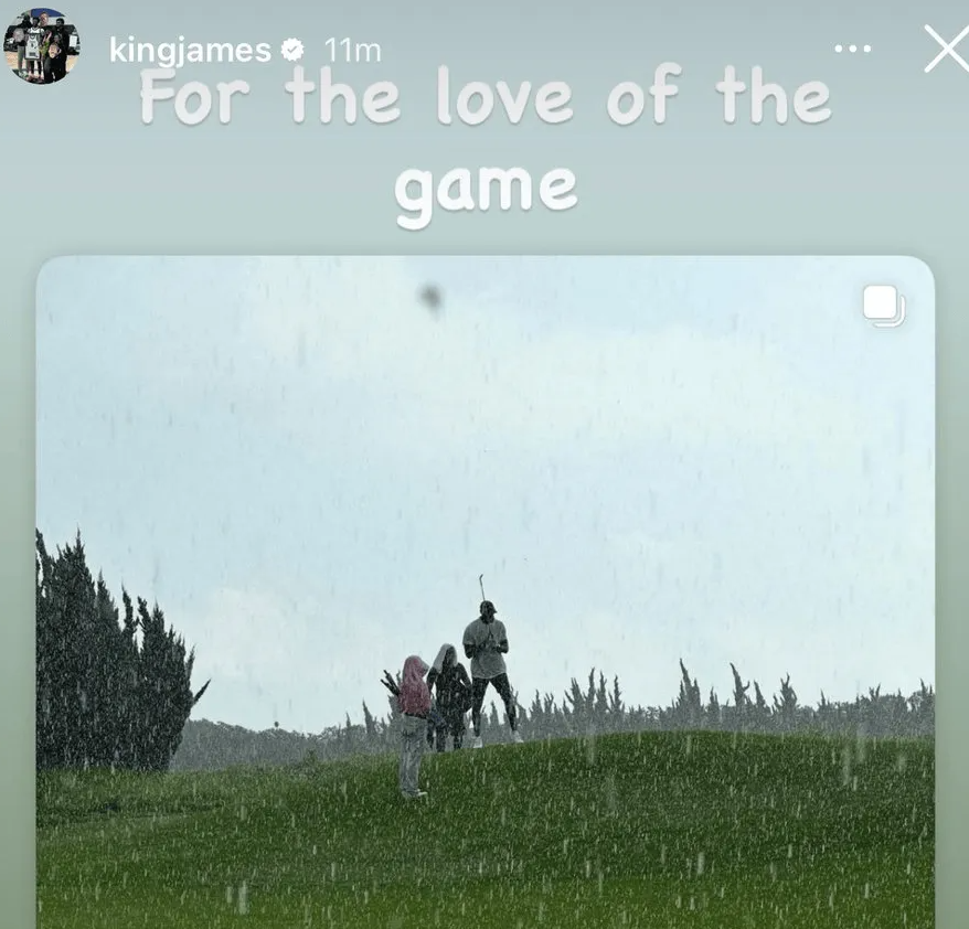 湖人球员勒布朗-詹姆斯更新Ins快拍,转发了一张自己在雨中打高尔夫的照片并配文: 出于对这项运动的热爱。 近日詹姆斯2025中国行正在进行中,首站来到上海。