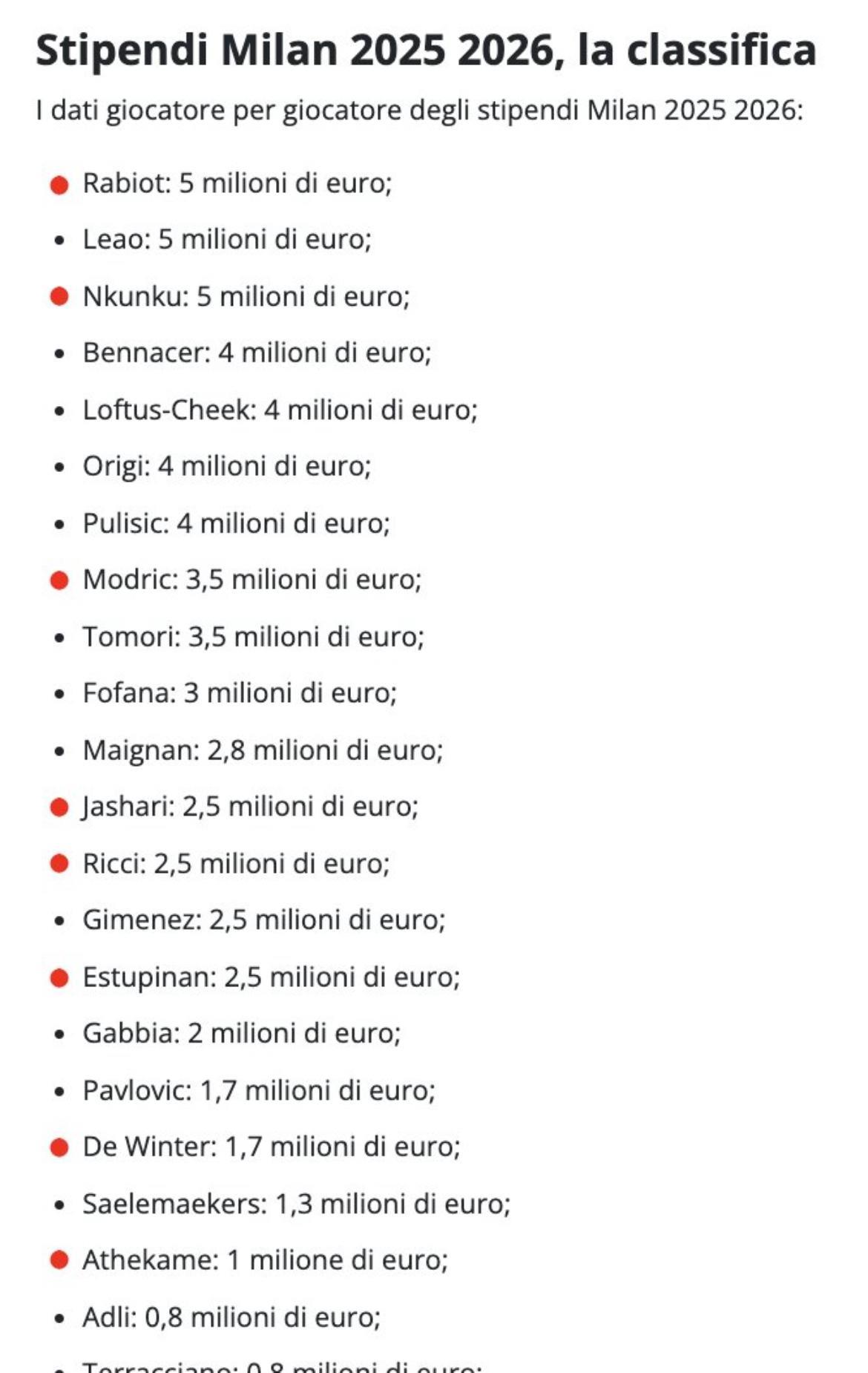 #我的主队# #AC米兰# 经过了一个热闹的转会窗,走了很多人,来了很多人,神奇的是,从经济的角度上看,米兰的工资总额仍然维持在了一个和上赛季相当的水平。 足球与财经杂志的报道,米兰本赛季的薪资总额较上赛季略有下降,基本和上赛季持平,都是1.05亿欧左右。这个工资水平,上赛季能排到意甲第三,少于国际和尤文。这个赛季就只能排第五了,那不勒斯和罗马反超了。 而且这个1.05亿里面还包含了本纳赛尔的400万欧(本纳赛尔已经租借去萨格勒布迪纳摩了),拉比奥特的年薪也被统计成了500万欧(莫雷托说他的薪水350万欧),所以可以说米兰的薪资降了不少。符合本赛季无欧战,阵容精简的预期。 下一步,美队和麦尼昂要续约了,都得涨薪,这个数据可能还会有变动,另外,排名前列的要是能把奥里吉处理掉就完美了…….