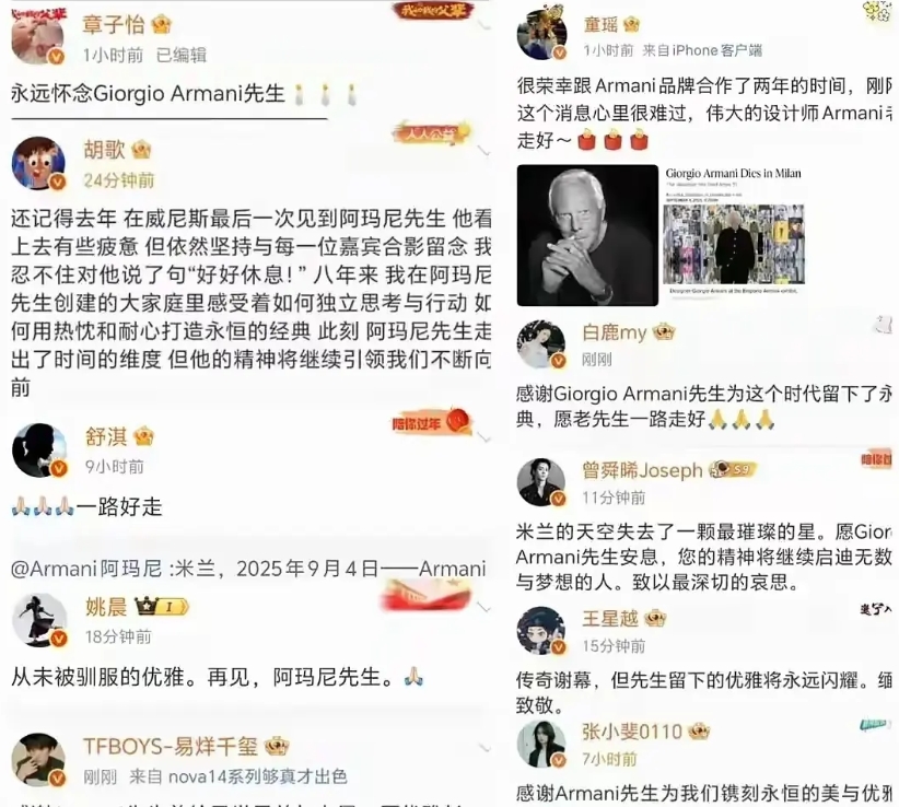 阿玛尼官方账号发布了阿玛尼去世的消息,娱乐圈好几个大明星纷纷发文怀念。