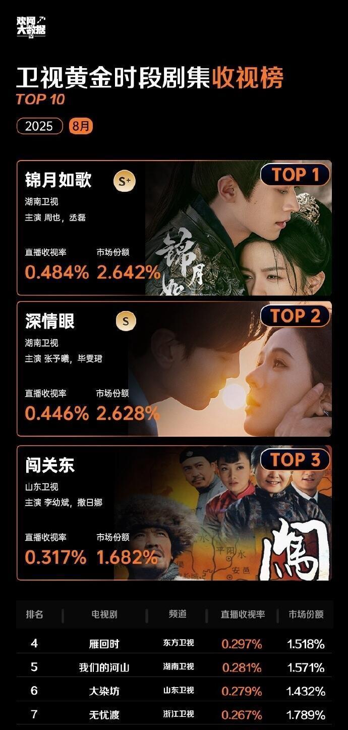 8月卫视收视排行,湖南卫视大获全胜 8月卫视收视榜新鲜出炉!音乐综艺《歌手2025》实力登顶,湖南卫视再下一城。《锦月如歌》领跑电视剧收视,稳居榜首。湖南卫视更是霸气包揽综艺榜和电视剧榜前二,你追的节目上榜了吗?