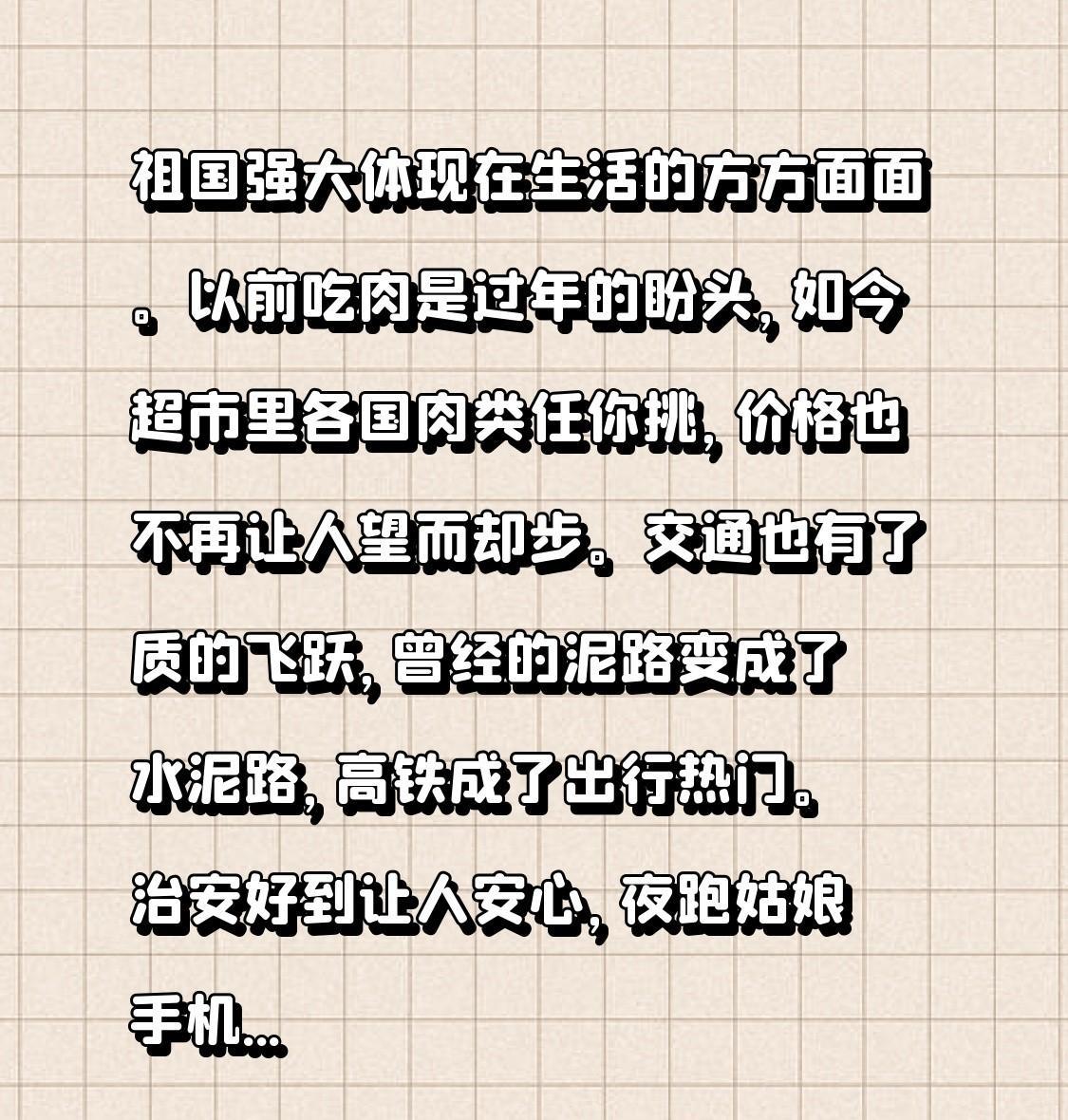祖国强大体现在生活的方方面面。以前吃肉是过年的盼头,如今超市里各国肉类任你挑,价格也不再让人望而却步。交通也有了质的飞跃,曾经的泥路变成了水泥路,高铁成了出行热门。治安好到让人安心,夜跑姑娘手机露半截也不怕被抢。中文走向世界,非洲小哥都能说一口流利东北话。制造业更是今非昔比,“Made in China”不再只是便宜的代名词,国产技术广泛应用。这些细节,都在证明祖国真的强大了。