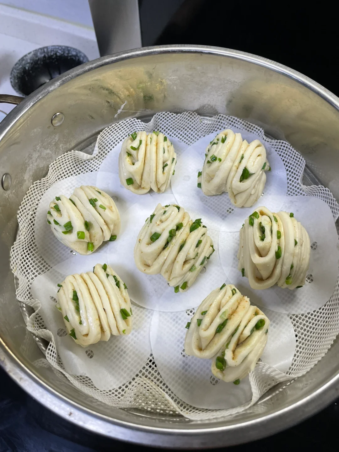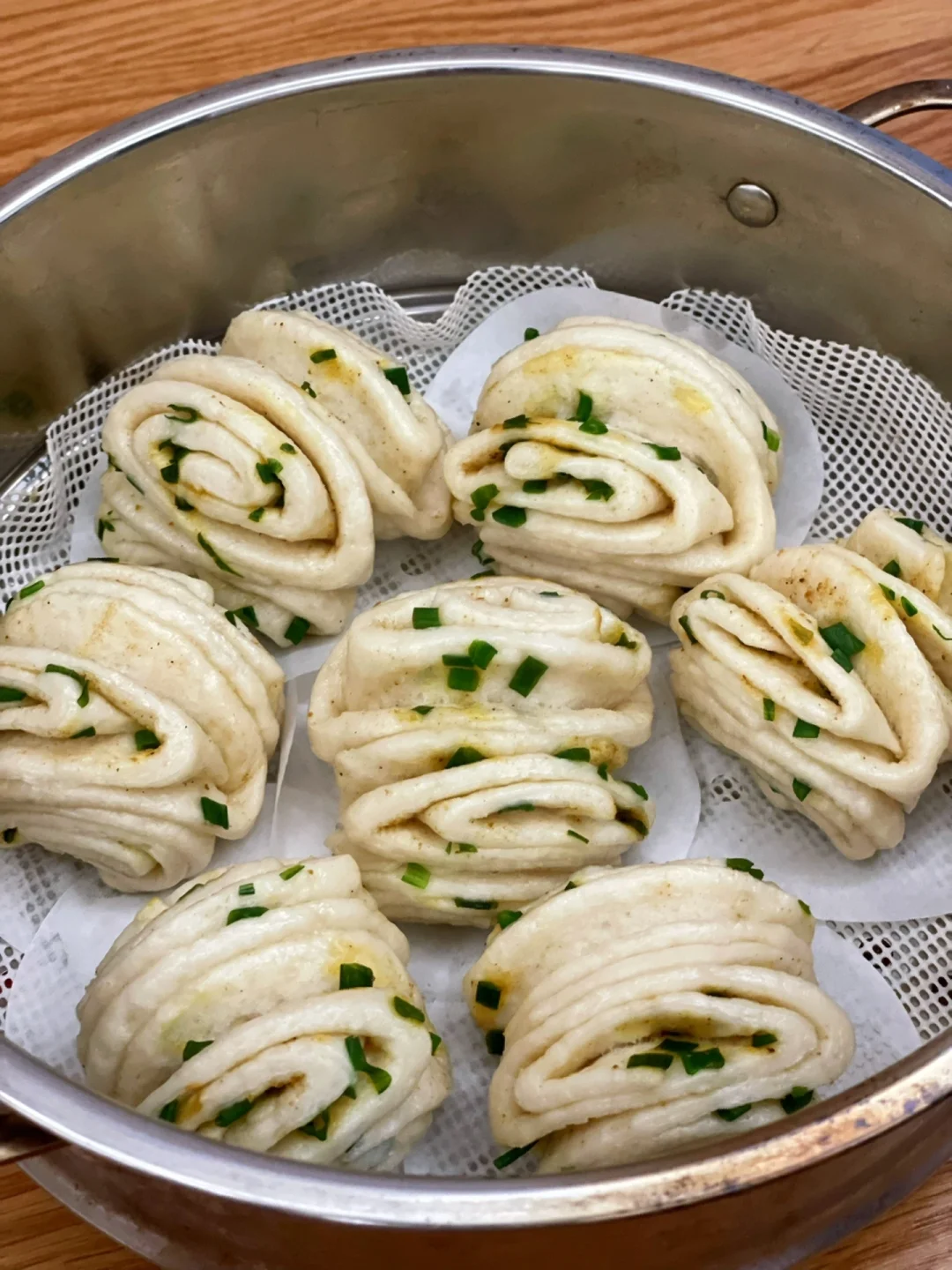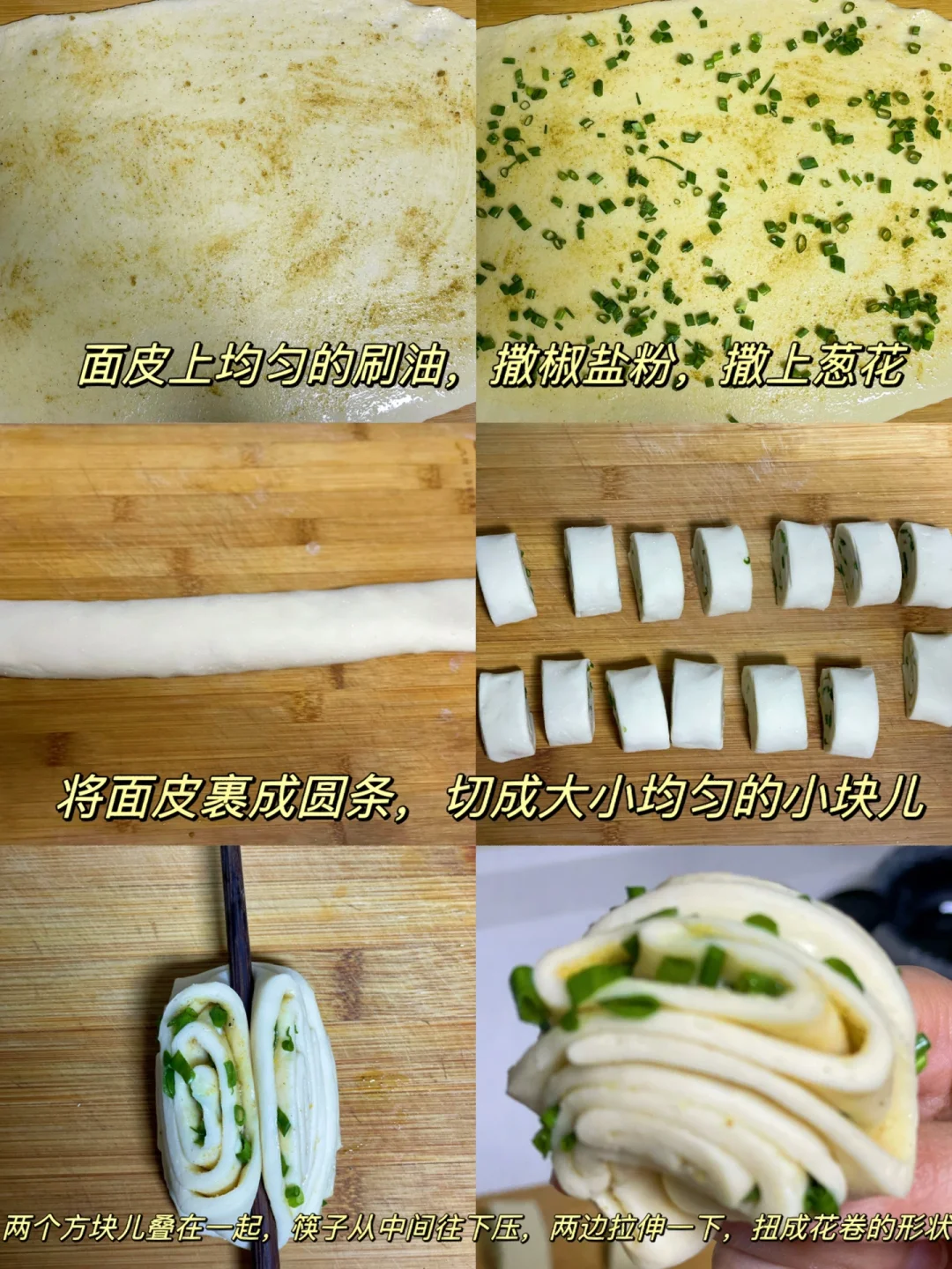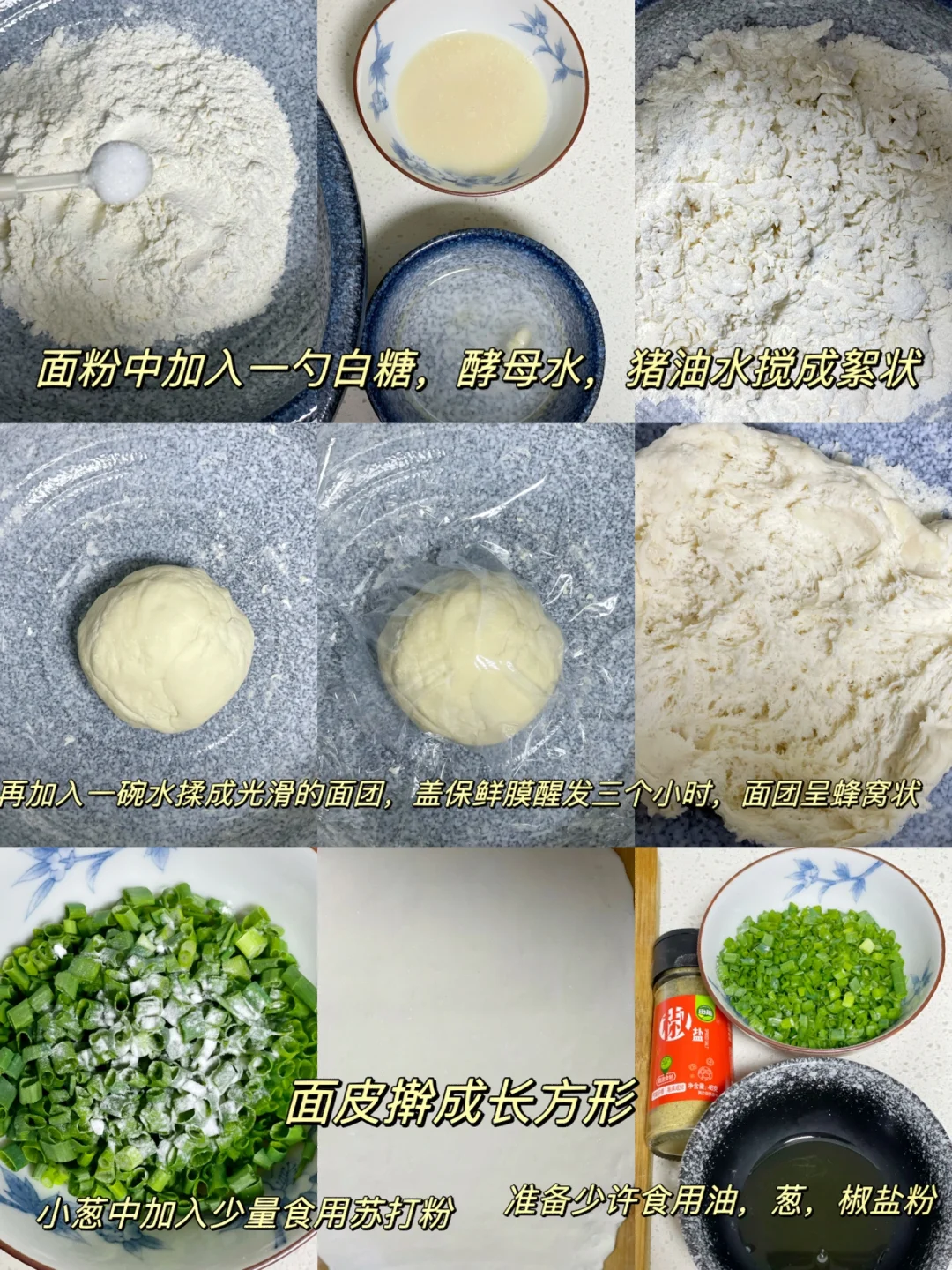 🍀🍀🍀面粉200克,酵母2克,猪油5克,白糖5克,水100克,葱花适量,椒盐,食用油